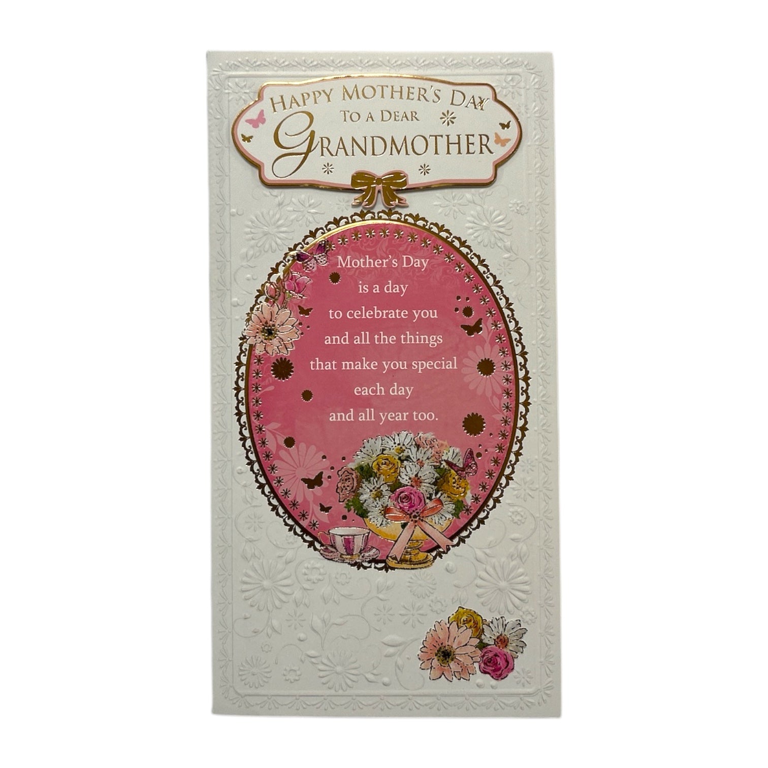 A Mother's Day greeting card features a decorative oval frame with floral designs and the text "Happy Mother's Day to a Dear Grandmother." The card's design includes a pink oval with a bouquet of flowers and butterflies. The inside of the oval contains a message wishing a happy Mother's Day. The card has a white background with an embossed floral pattern. The card comes with a coordinating envelope. Card size approx. : 27.5 x 18.5cm.