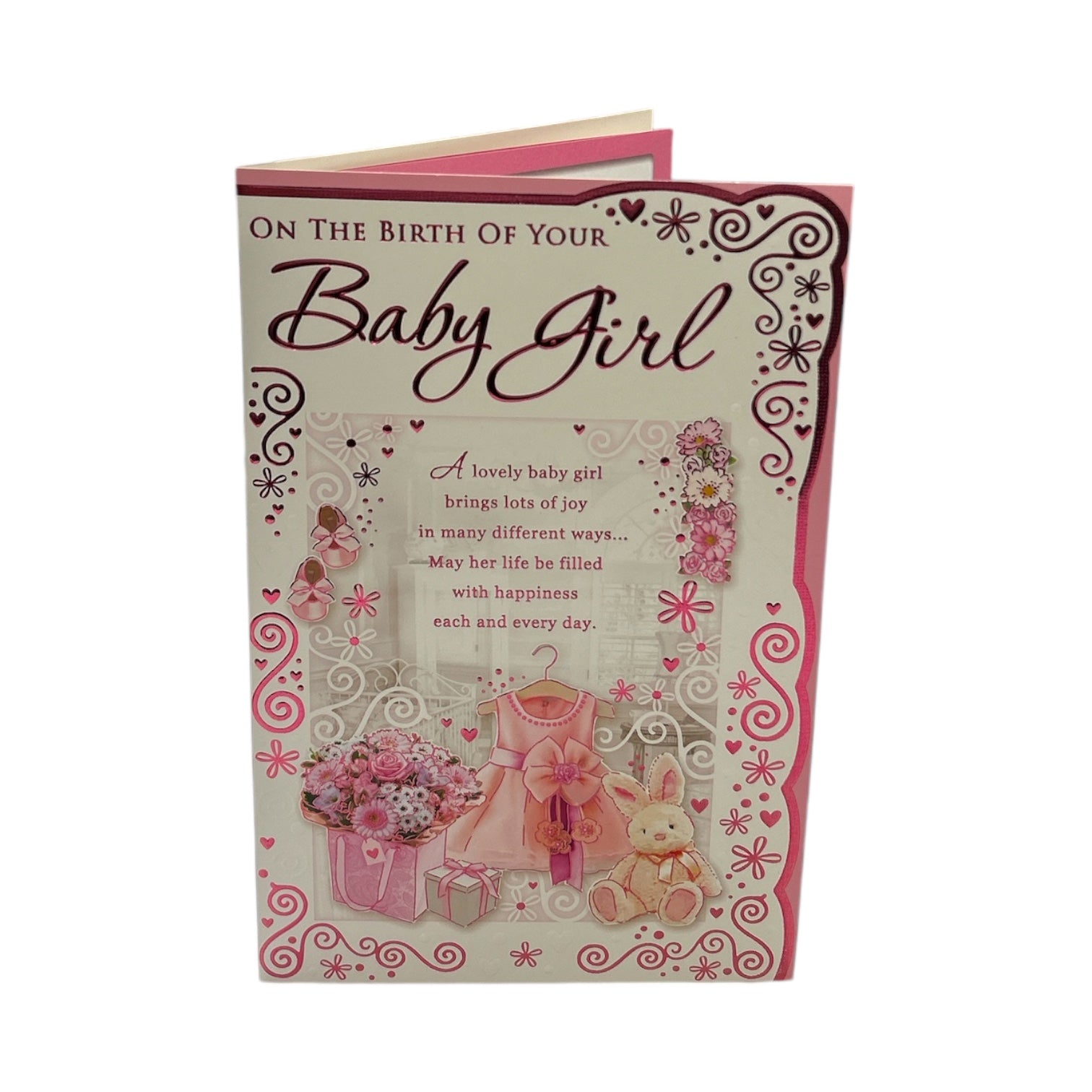 Celebrate the joyous arrival of a precious baby girl with this beautifully designed congratulations card. The front features an adorable tiny pink dress, matching pink shoes, a sweet pink teddy, and a delicate pink flower bouquet, all enhanced with elegant embossed details for a charming touch. A lovely verse graces the front, while the inside continues with the same delightful design and heartfelt wishes to welcome the new arrival. The card comes with a coordinating envelope. Approximate size: 9" x 4.75" (23 cm x 12 cm).