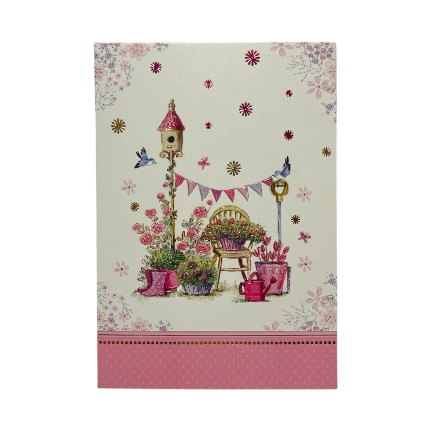 This beautifully illustrated greeting card captures the essence of a whimsical garden scene, featuring delicate flowers, chirping birds, a charming birdhouse, and classic garden tools, all set against a soft cream background. At the heart of the design, a vintage-style wooden chair sits gracefully among flower pots and gardening essentials, evoking a peaceful and serene atmosphere. The background is adorned with a lush array of blooming flowers and delicate leaves, enhancing the dreamy, storybook-like quality of the scene. Rendered in soft pastel hues with gentle, flowing lines, this enchanting design exudes warmth and elegance. The inside is blank, allowing you to add your own personal message for any occasion. The card comes with a coordinating envelope. Card size: Approx. 19.5 x 14 cm.