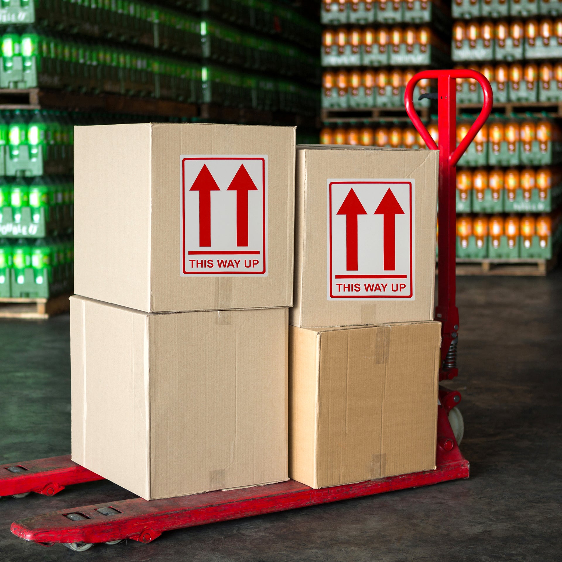 Pack of 3 This Way UP Self-Adhesive Labels 80x110mm. Ensure proper handling of your packages with these This Way UP Self-Adhesive Labels. Measuring 80x110mm, the labels are ideal for boxes, parcels, and fragile shipments. Supplied in a pack of 3, they feature a clear directional message to prevent damage during transit.