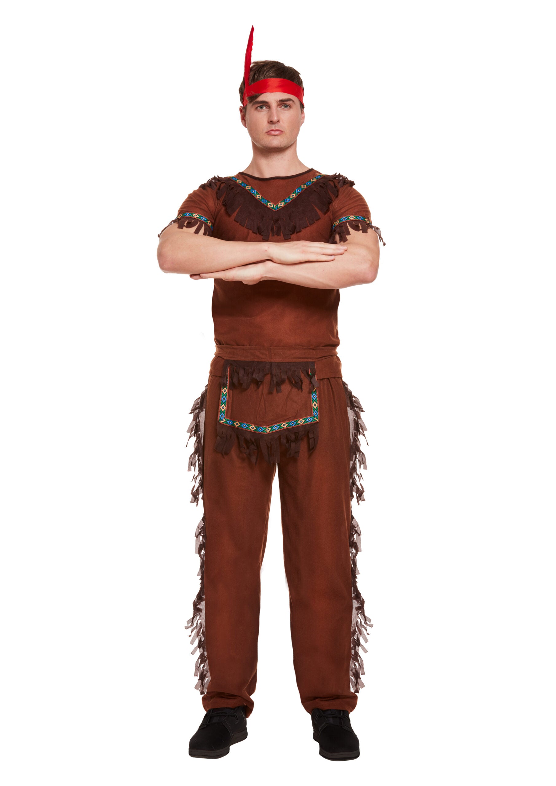 These American Indian themed adult fancy dress costume includes: headpiece, shirt, trousers and apron. Size: one size