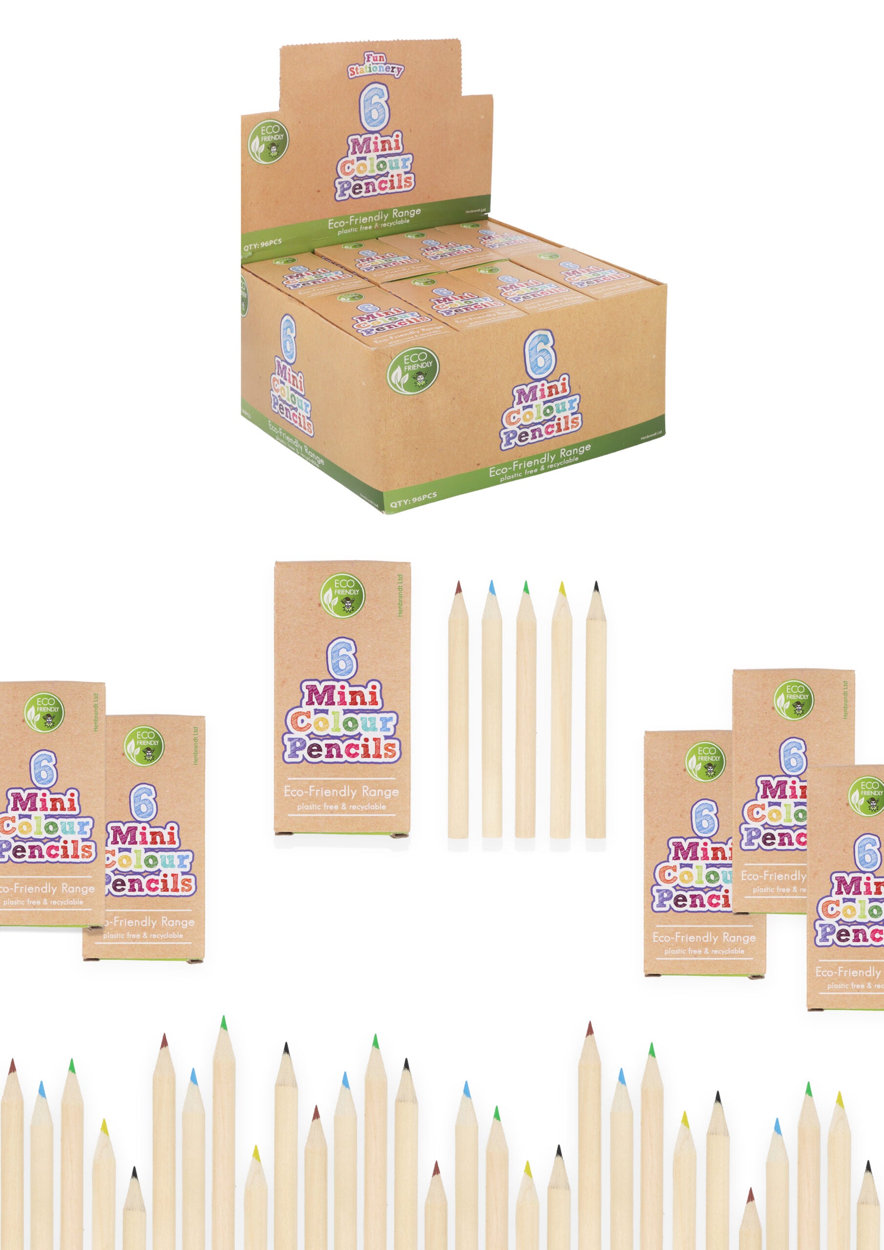 This eco-friendly mini pencil set includes 6 mini colouring pencils in Black, Blue, Brown, Green, Red and Yellow. The pencil set contains no plastic content and is fully recyclable. Size: 8.5cm.
