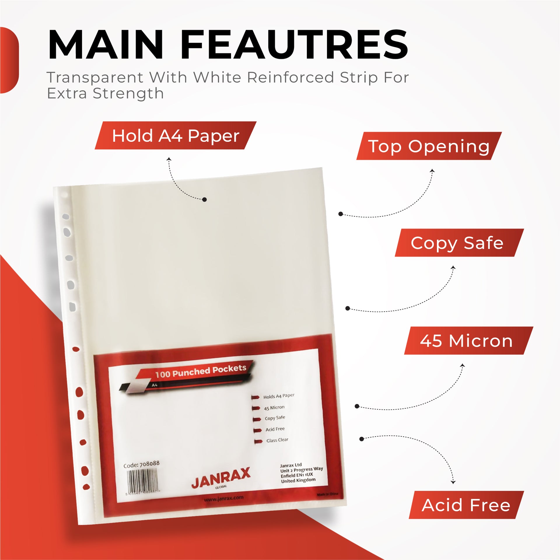 Pack of 100 A4 Glass Clear Punched Pockets by Janrax. Transparent with white reinforced strip for extra strength. Spines are multi-hole punched to fit any filing or portfolio system. Holds A4 Paper, Top Opening. 45 Micron. Copy Safe, Acid Free.