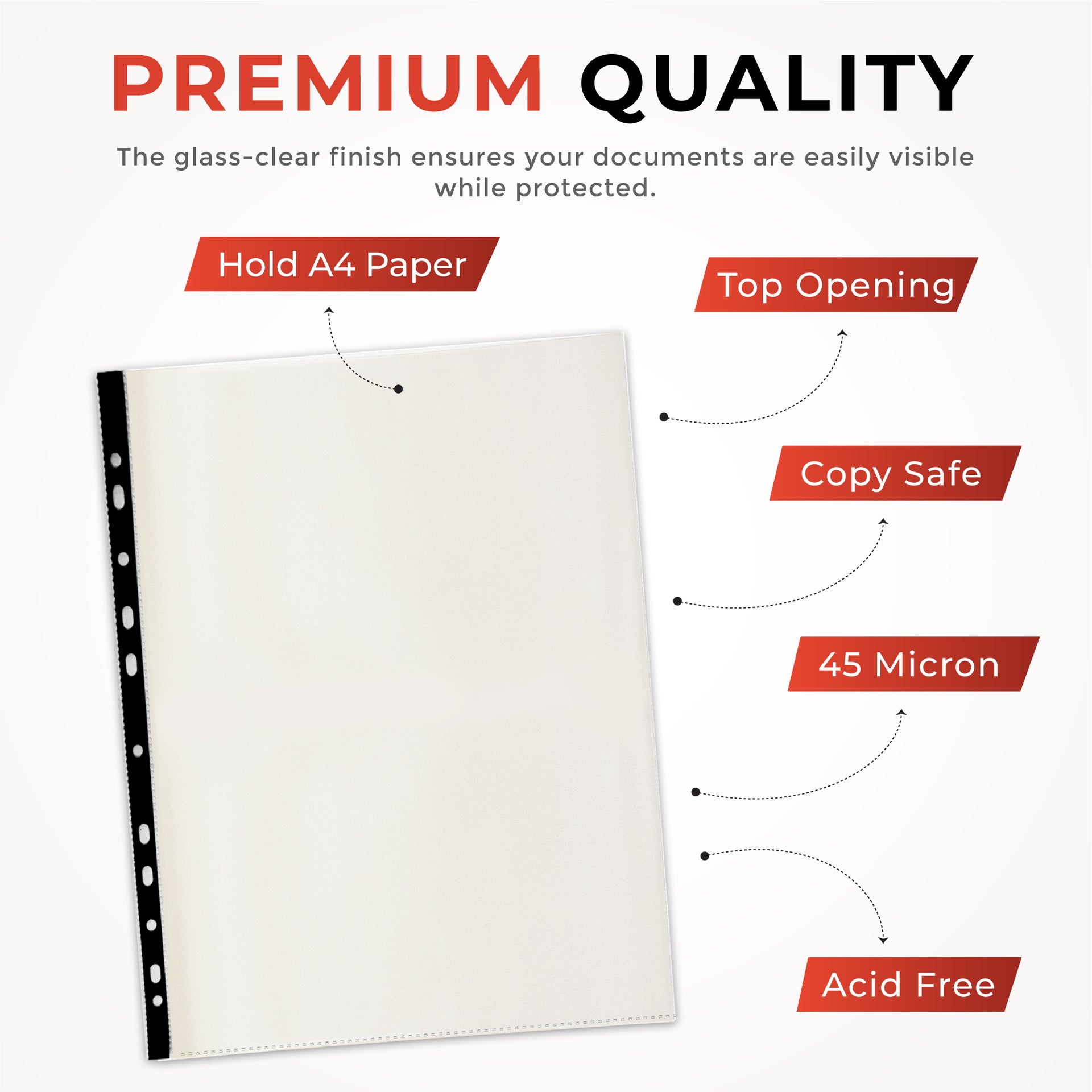 Pack of 25 A4 Punched Pockets with Assorted Coloured Reinforced Strip. Organise your documents effortlessly with our A4 Punched Pockets featuring an Assorted Coloured Strip. These pockets are designed with a coloured strip along with the multi-punched, reinforced holes, available in five vibrant shades: green, yellow, red, black, and blue. The glass-clear finish ensures your documents are easily visible while protected. This design makes them ideal for indexing and easy access while ensuring durability and preventing tearing. Each pocket is made to hold A4 paper securely, providing a practical solution for keeping your documents neat and protected. Crafted from 45-micron polypropylene, they are durable, acid-free, and copy safe, ensuring your important papers are preserved without damage. Perfect for use in offices, schools, and home environments, these punched pockets help you maintain an organised and efficient filing system. Elevate your document storage with these versatile and colourful punched pockets.