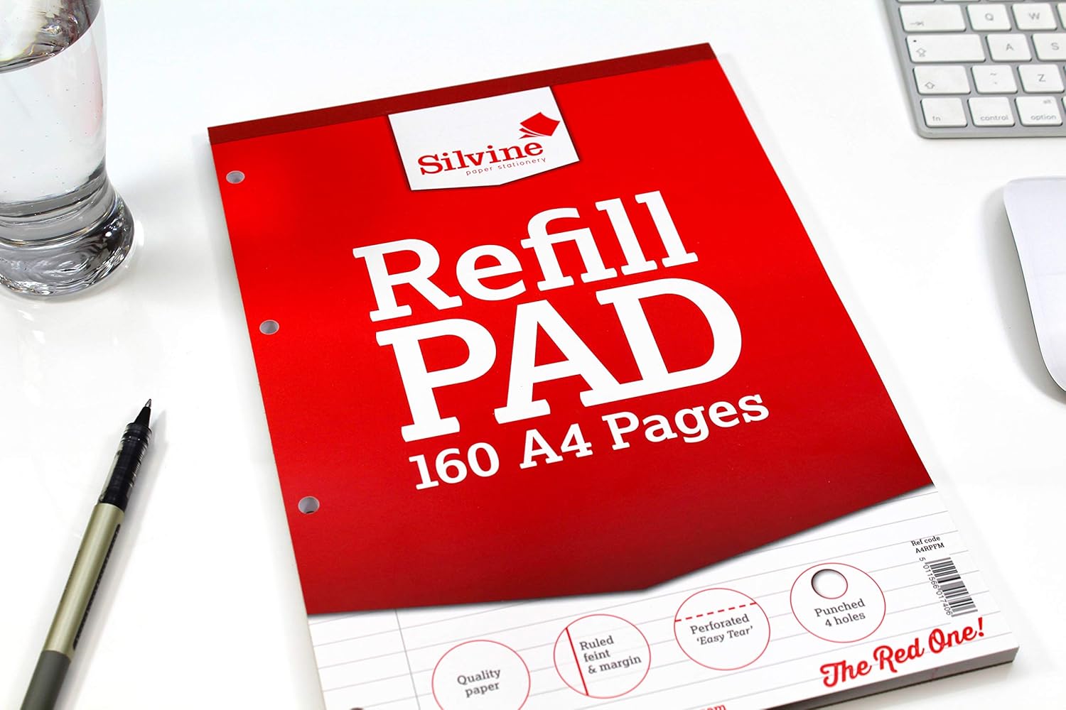 Silvine 160 page A4 refill pad.Perforated, head bound and punched with four holes. 8mm Ruled feint with margin. Made in the UK using 75gsm quality white paper.