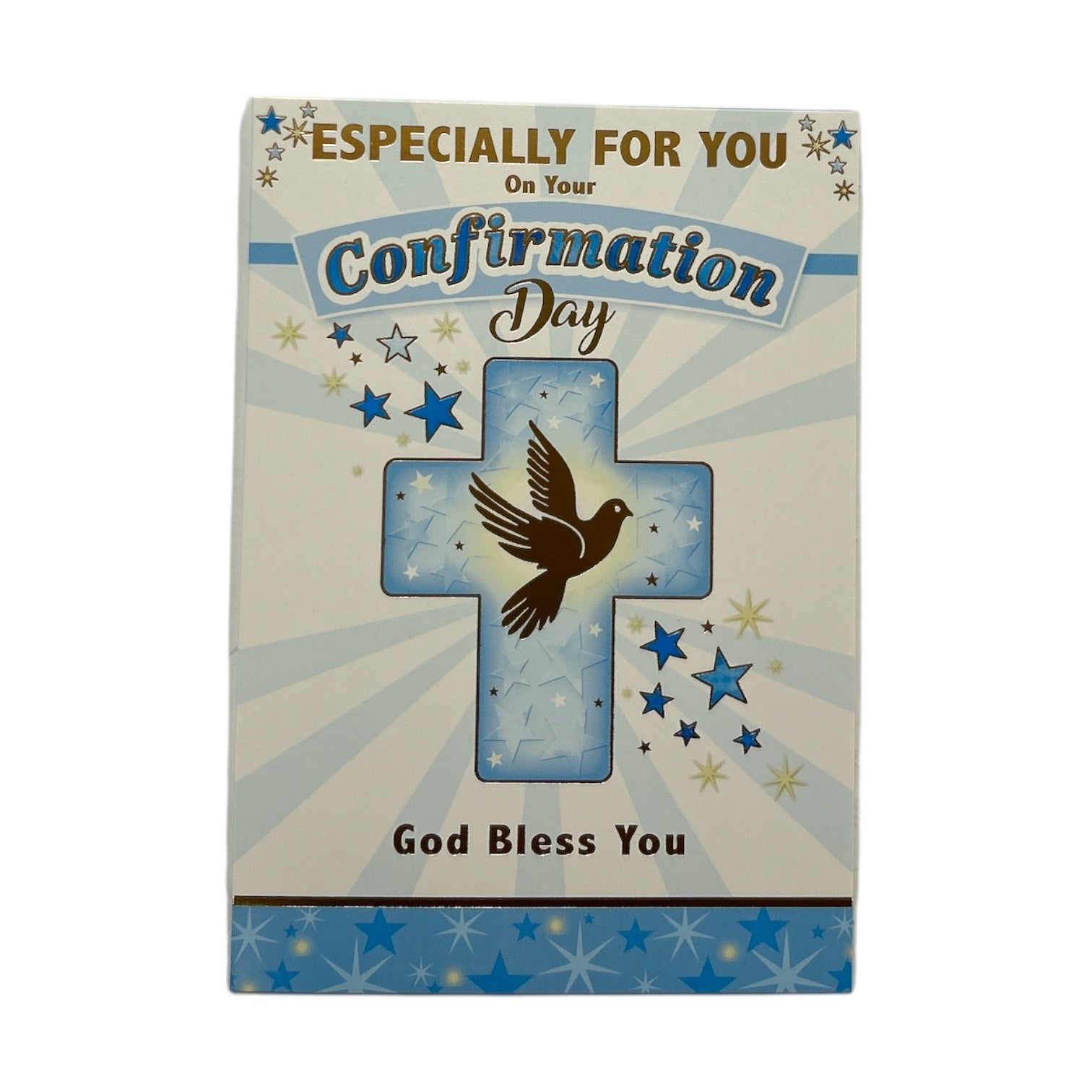 This beautifully designed Confirmation card features a soft blue color palette, symbolizing grace and devotion. At the center, a delicate cross is displayed against a light cream background, adorned with a dark brown dove in flight, representing the Holy Spirit’s presence and guidance. To enhance its elegant and uplifting design, the card is decorated with small blue flowers and shimmering gold stars, adding a sense of joy and reverence to the occasion. The words "Especially For You," "On Your Confirmation Day," and "God Bless You" are written in a gold-colored, stylized font, creating a warm and heartfelt message of faith, love, and blessings for this special milestone. The card comes with a coordinating envelope. Card size: Approx. 19.5 x 14 cm.