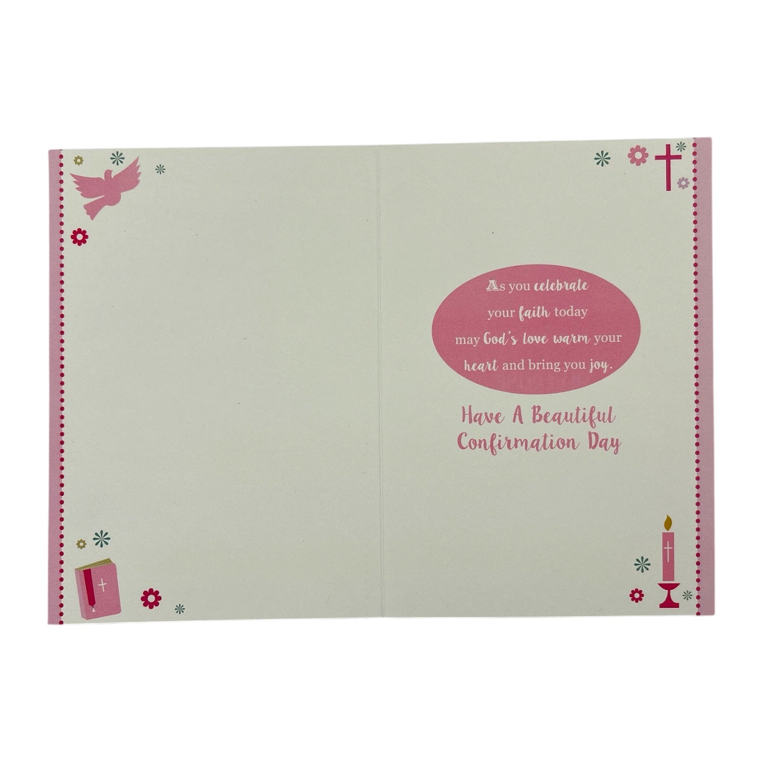 This graceful and uplifting Confirmation card celebrates a significant milestone in faith. The word "Confirmation" is prominently displayed in an elegant, stylized font, serving as the focal point of the design. Surrounding it are delicate decorative elements, including flowers, doves, and candles, symbolizing peace, purity, and the light of faith. Set against a light cream background, the card features soft pink and gold accents, adding a touch of warmth and elegance. Inside, a heartfelt message extends prayers and blessings, encouraging a continued journey in faith and spiritual growth. The card comes with a coordinating envelope. Card size: Approx. 19.5 x 14 cm.