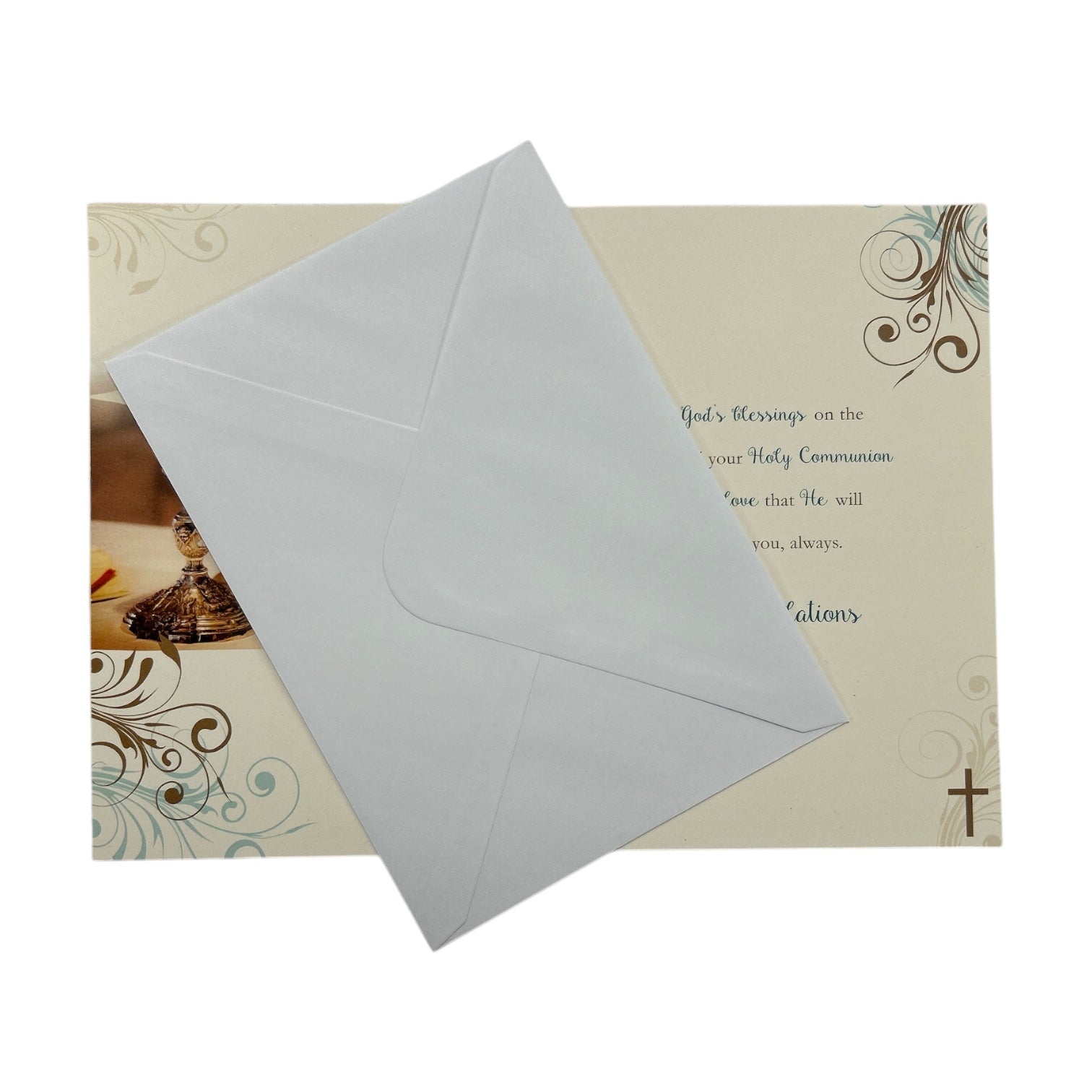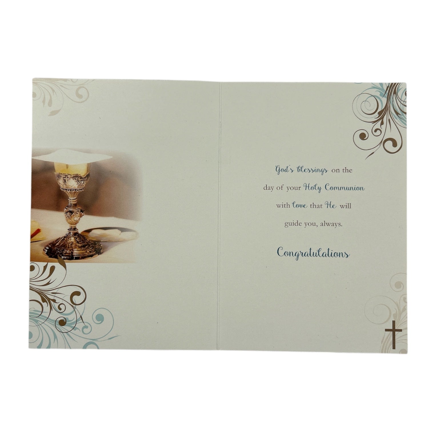 This beautifully designed First Holy Communion card for a beloved grandson embodies faith, devotion, and spiritual blessings. The design features a golden-toned chalice, carefully placed on a small plate and draped with a white cloth, symbolizing the sacredness of the Eucharist. The background is a soft, muted beige-cream color, providing a warm and gentle tone, while delicate gold accents and decorative swirling patterns add an element of elegance and reverence. The words "For You Grandson on Your First Holy Communion" are displayed in a graceful, refined typeface, emphasizing the significance of this blessed occasion. Inside, a heartfelt message conveys love, prayers, and blessings, celebrating this cherished spiritual milestone. The card comes with a coordinating envelope. Card size: Approx. 19.5 x 14 cm.