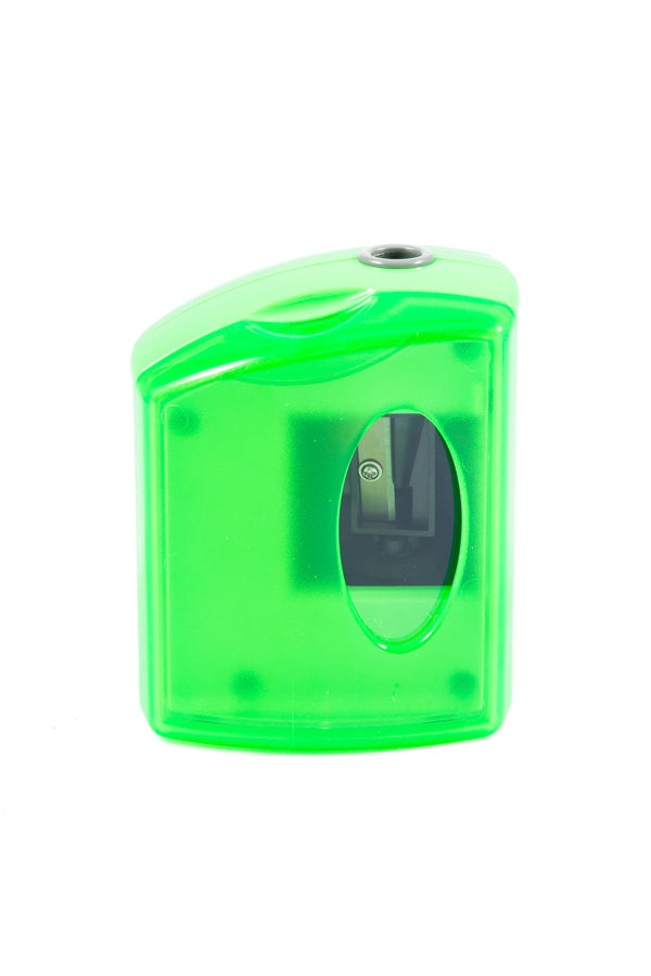 Pencil sharpener, single hole, battery/mains operated sharpener for regular pencils. Requires 4 x AA batteries. Available in Neon Green, Pink and Blue colours. One random colour will be supplied. (batteries and AC adapter not included).