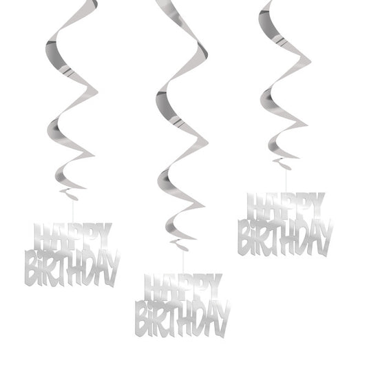 Pack of 6 12" Glitz Black, Silver, & White Latex Balloons "Happy Birthday"