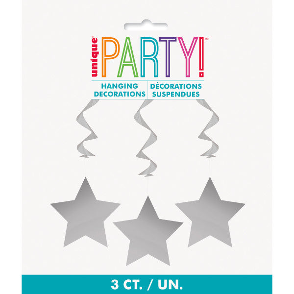 Pack of 3 26" Silver Solid Hanging Swirl Decorations. These beautiful swirls feature pink star paper cutouts attached to metallic pink foil swirls. This product is an awesome addition to your birthday party decors, bridal showers, and other fun events. This product is made of brightly-colored foil and durable paper materials.These hanging swirls are easy to assemble, install, and can be stored and re-used.