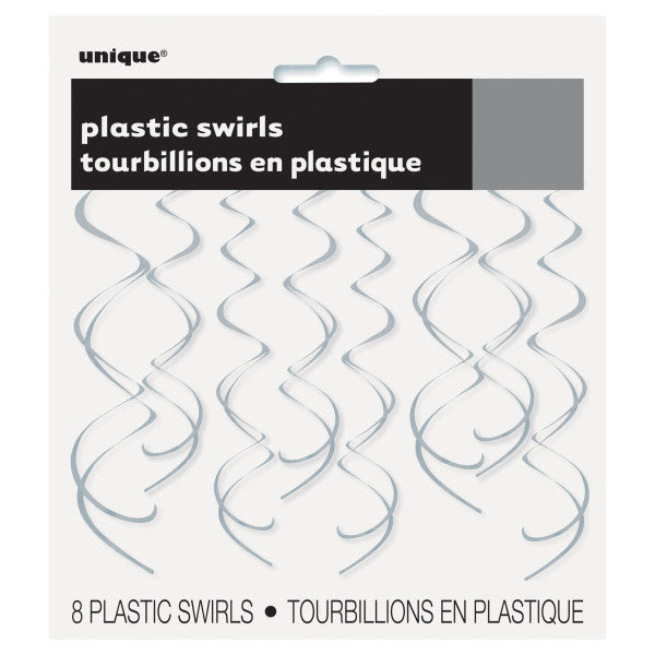 Pack of 8 Silver Solid Hanging Swirl Decorations. Plastic Silver Hanging Swirl Decorations. 8 Swirls - 26". This hanging decoration features silver-coloured plastic hanging swirls. This lovely decoration is great for birthdays, weddings, or any special events. Our high quality swirl decorations add a beautiful atmosphere to any room or party event.