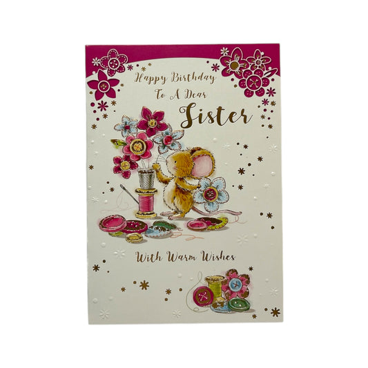 To Dear Sister Cute Mouse Create Flowers Design Birthday Card