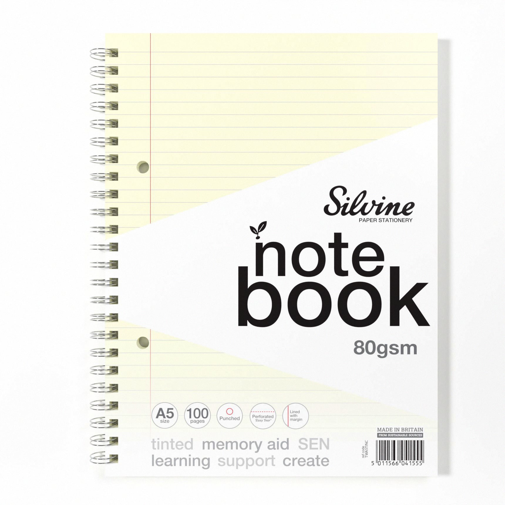 Silvine A5 Cream Paper Dyslexia Notebook - Lined with Margin (100 Pages). Specifically designed with cream tinted paper, our premium 80gsm wirebound notebook reduces visual stress and enhances focus, making it an ideal memory aid for SEN supportive learners. Visual aid notebook with feint ruled lines and margin which subtly fade into the background to ensure your writing stands out, promoting better focus and clarity. The robust wire binding allows the notebook to lay perfectly flat for comfortable writing on any surface, while punch holes and micro-perforations enable easy organization and filing. This A5 cream tinted notebook offers 100 pages of high-quality 80gsm paper for longer study sessions, note-taking, and assignments; covering your academic and professional needs. Slightly larger than standard A5, removed pages remain full-size ensuring seamless filing in folders and binders. Finished notebook dimensions - Sidebound 212 x 159.5 mm.