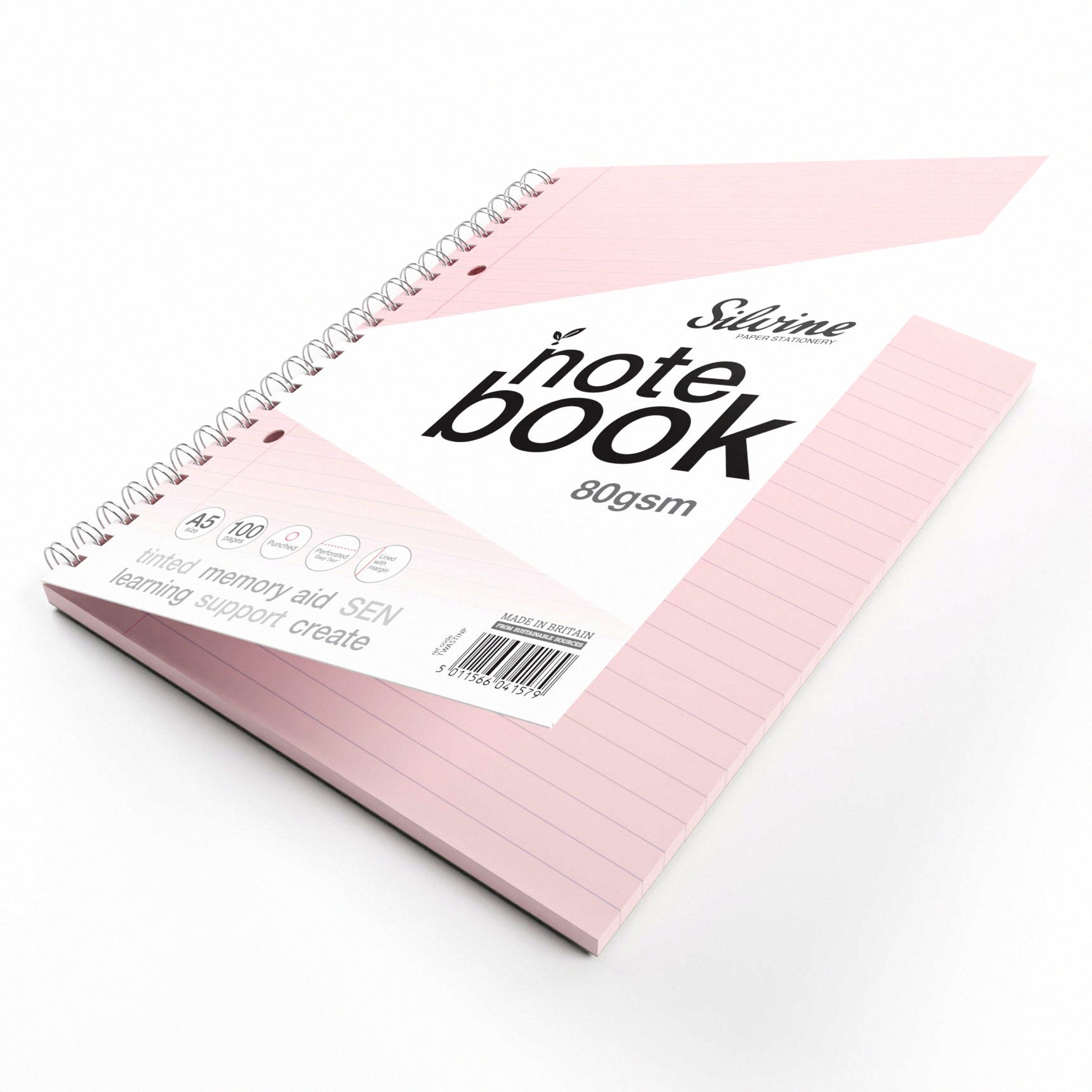 Silvine A5 Pink Paper Dyslexia Notebook - Lined with Margin (100 Pages). Specifically designed with pink tinted paper, our premium 80gsm wirebound notebook reduces visual stress and enhances focus, making it an ideal memory aid for SEN supportive learners. Visual aid notebook with feint ruled lines and margin which subtly fade into the background to ensure your writing stands out, promoting better focus and clarity. The robust wire binding allows the notebook to lay perfectly flat for comfortable writing on any surface, while punch holes and micro-perforations enable easy organization and filing. This A5 pink tinted notebook offers 100 pages of high-quality 80gsm paper for longer study sessions, note-taking, and assignments; covering your academic and professional needs. Slightly larger than standard A5, removed pages remain full-size ensuring seamless filing in folders and binders. Finished notebook dimensions - Sidebound 212 x 159.5 mm.