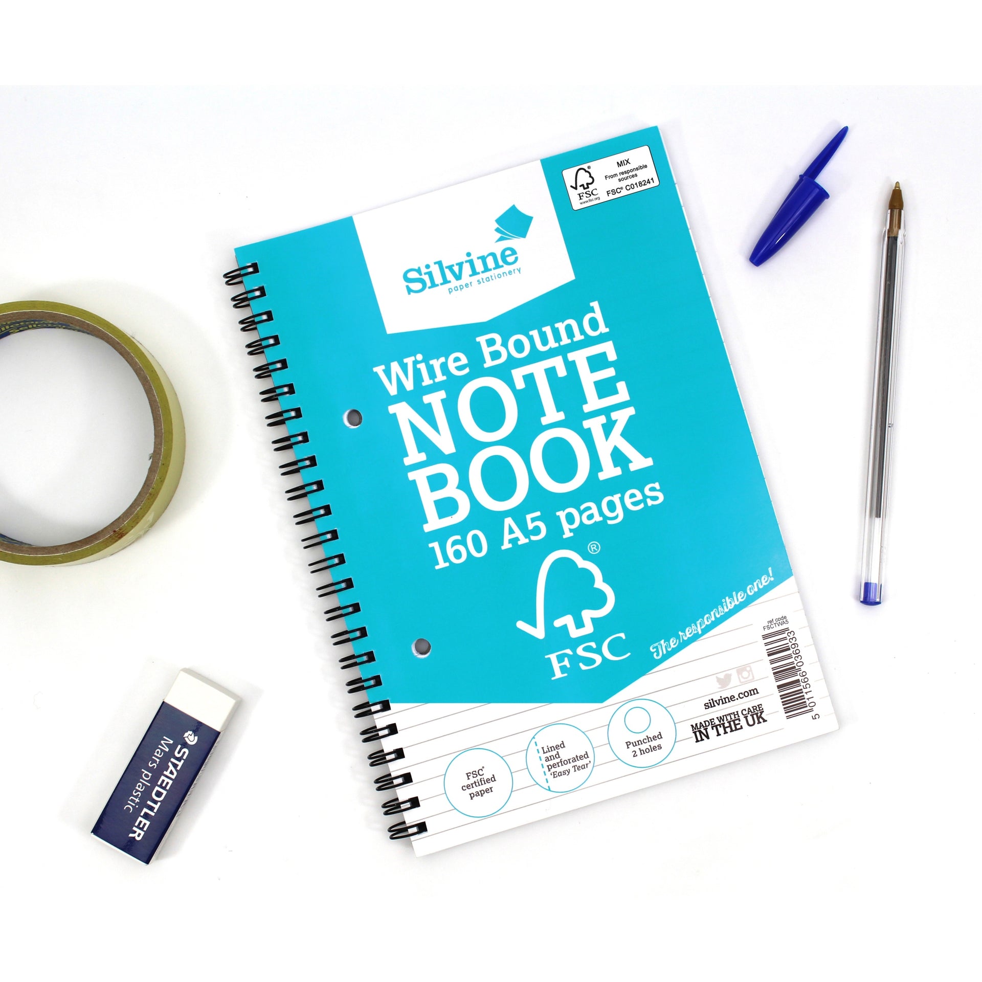 A5 FSC Certified Wirebound Notebook 160 Pages. New Forest Stewardship Council (FSC) Certified Range. Part of the Silvine Environment range offering high green credentials ensuring consumers are making the ethical and economical choice. Made from FSC® certified and recycled paper ensuring that the impact on the environment is minimised. Wire Bound Printed Cover. Feint ruled with margin. 160 pages (80 sheets). Perforated A5 for full A5 tear out.