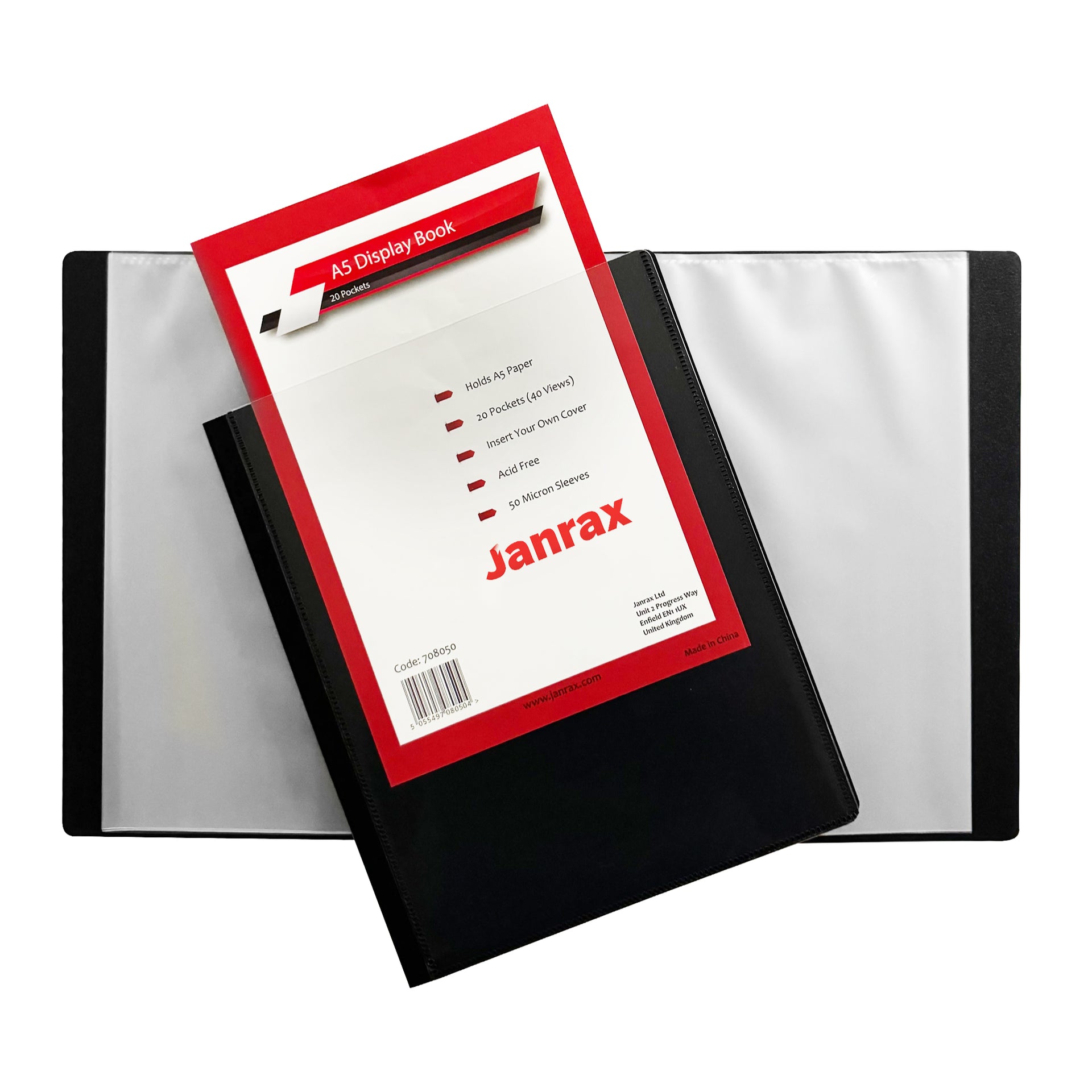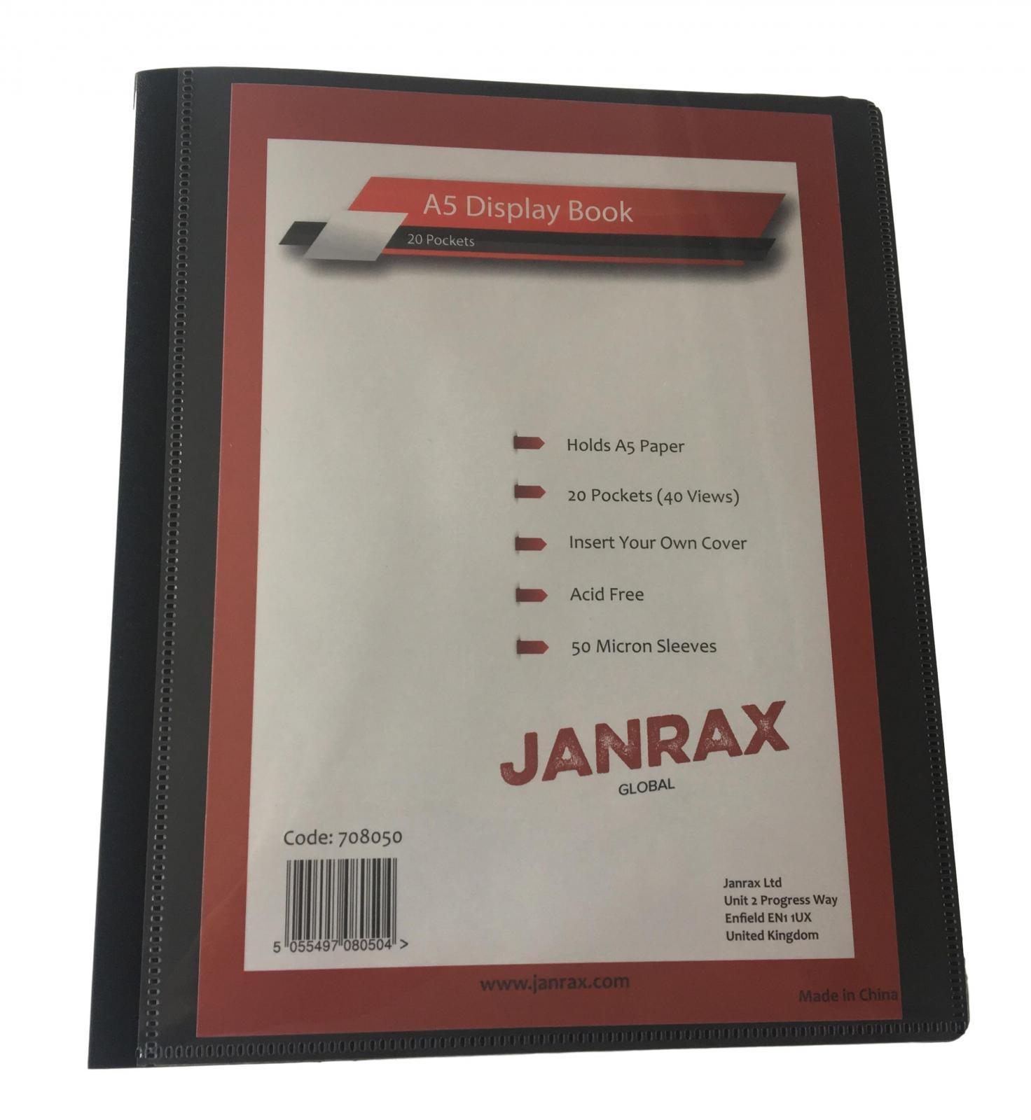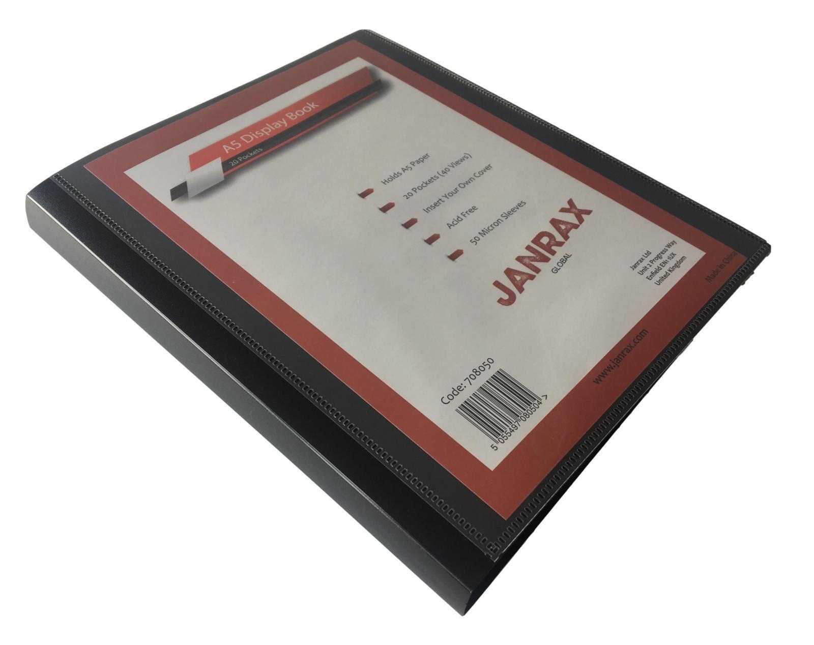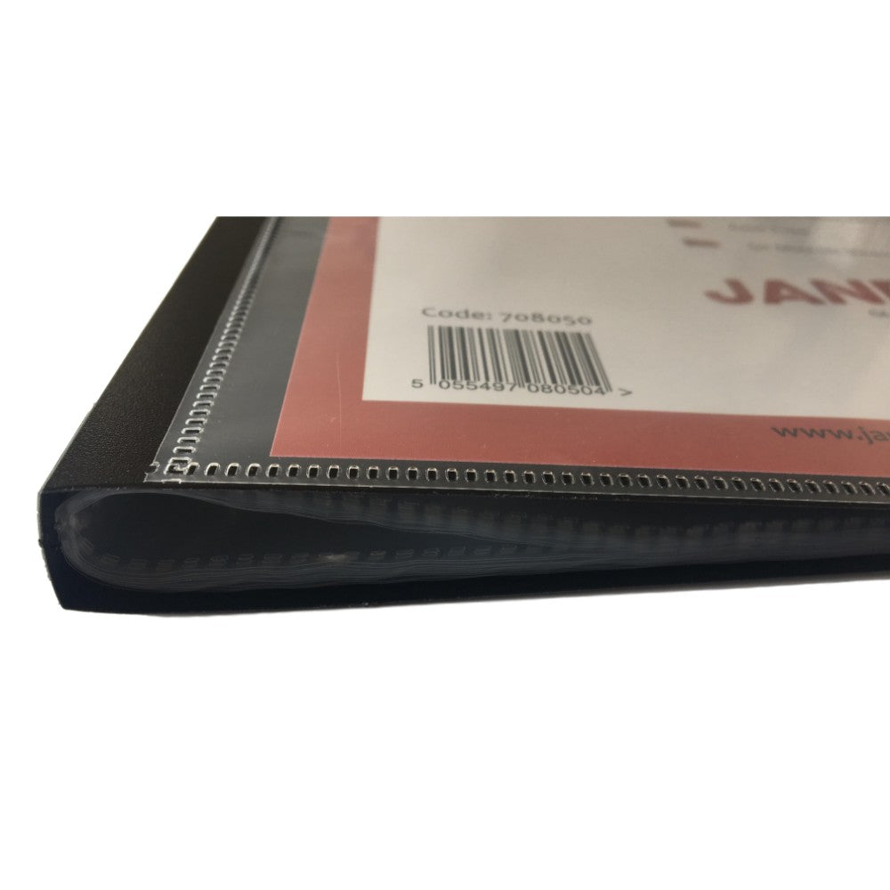 A5 Presentation Display Book by Janrax. 20 copysafe pockets (40 sides to view), removeable front sheet for personalised cover. 150 micron clear sheet + 600 micron cover/50 mic pockets. Black for professional presentations. Ideal size for menus, hymn sheets etc.