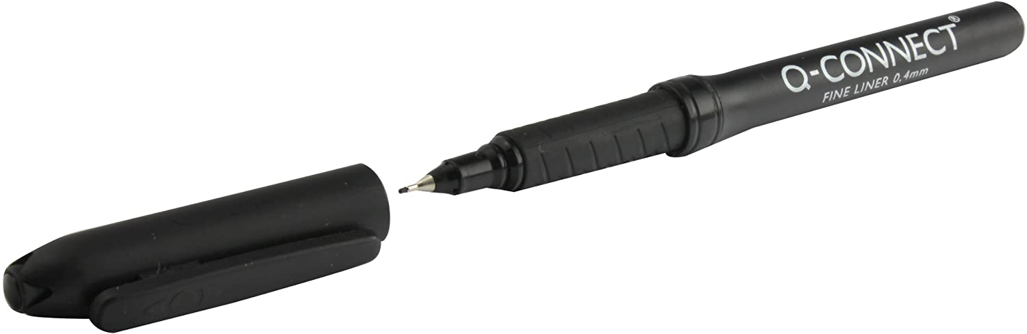Q-Connect Fineliner Pen. An ultrafine tip writes and draws fine and precisely ideal for writing ruling and stencilling. This classic fine line writer produces a 0.4mm line width and a write out length of over 1800 metres. Colour: Black.