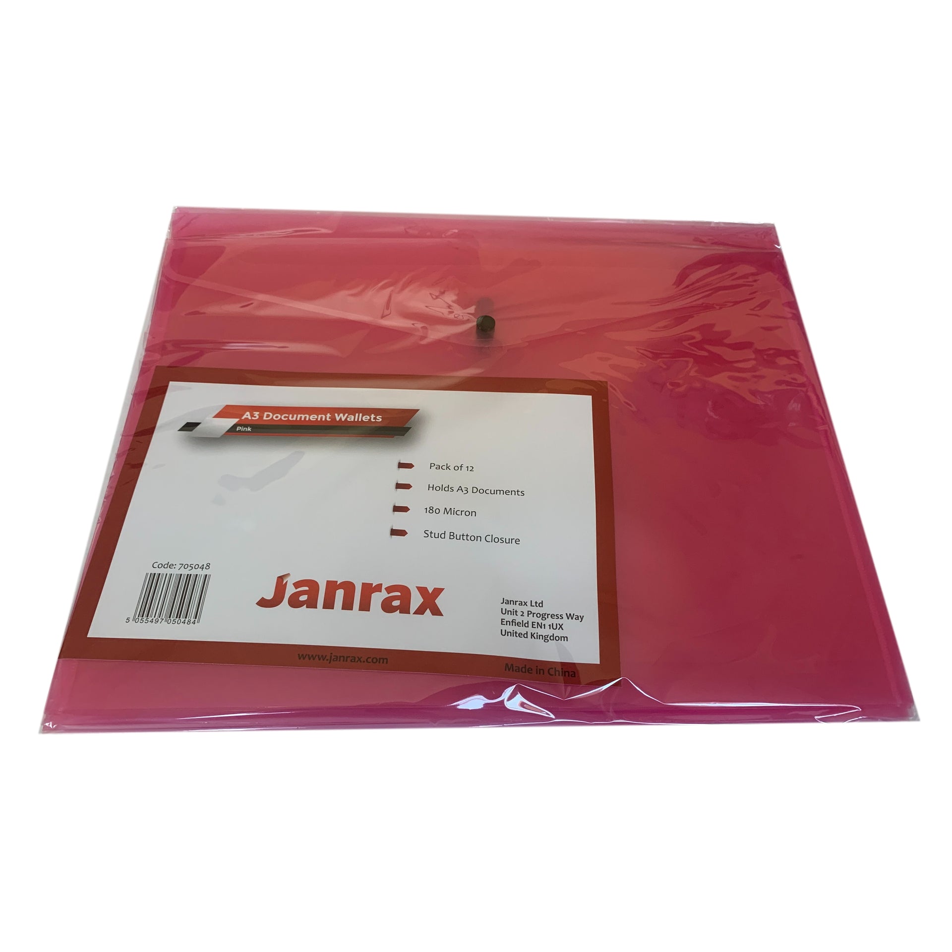 Pack of 12 Janrax A3 Pink Document Wallets - Button Stud Folder. Can hold up to 150 sheets of A3 paper. A press stud closure to help keep contents secure. Made from durable polypropyplene 180 micron. Trasparent folders for easy content viewing.