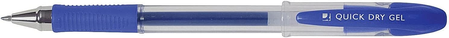Pack of 12 Quick Dry Medium Blue Gel Pens. This Q-Connect Gel Pen provides you with writing that is smooth and consistent, with crisp blue gel ink that is designed to dry quickly to prevent smudging and loss of legibility. The barrel is clear to allow you to monitor remaining ink levels before it runs out. A soft rubber grip helps you to write continuously without suffering from discomfort or pain, giving striking and smooth results. These blue pens are supplied in a pack of 12.