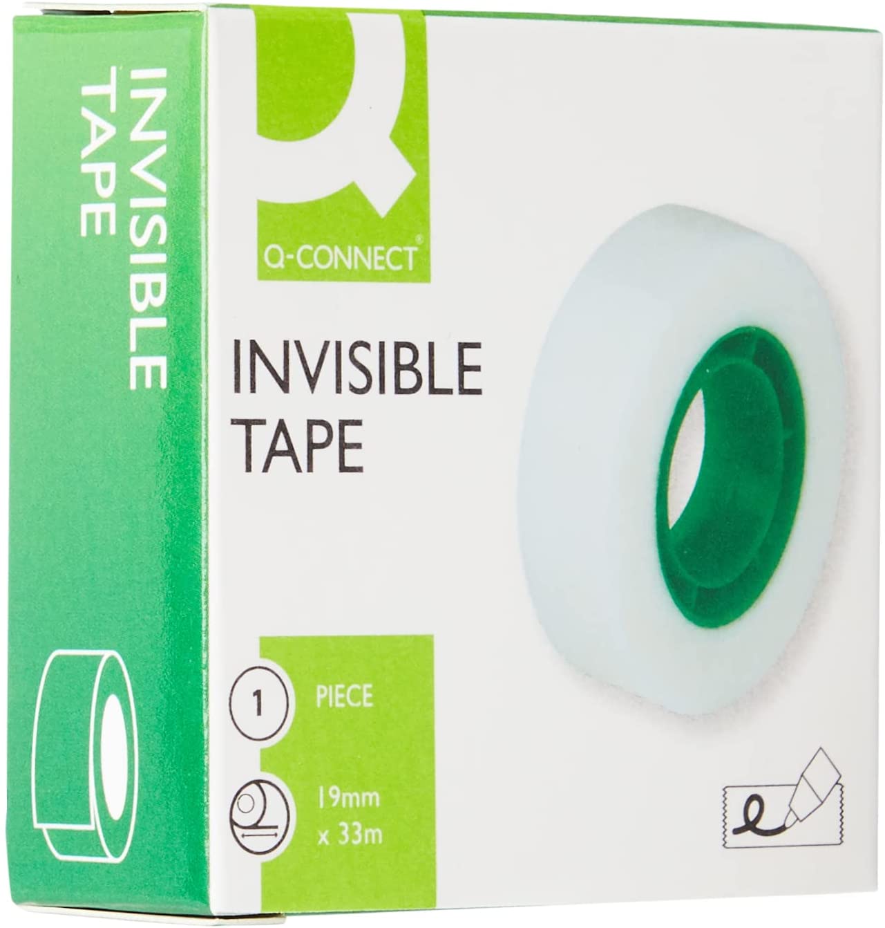 This Q-Connect invisible tape is ideal for mending tears and wrapping packages. It can be written on, typed on, photocopied and faxed, all without leaving a ghost mark. This pack contains 1 roll of tape measuring 19mm x 33m.