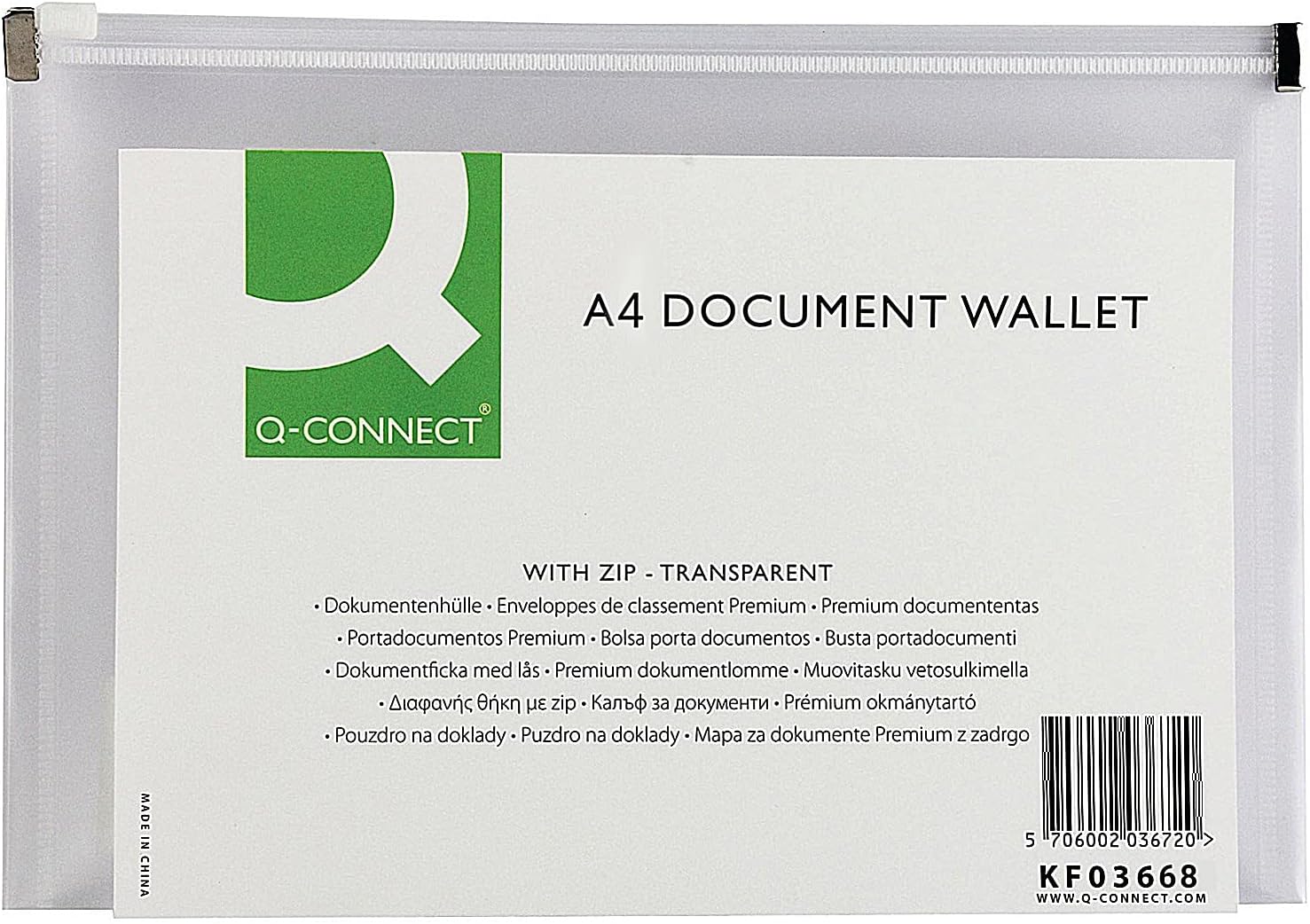 Q-Connect Zip Wallets. Lightweight transparent document wallets with plastic closure. Ideal for hundred of uses in office industry home and school. Size - A4 (320x230mm). Colour - Transparent.