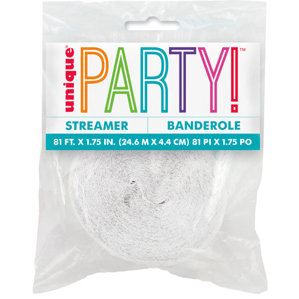 81ft White Crepe Streamer. This classic crepe streamer design can easily mix and match with your other coloruful decorations. This product is perfect for weddings, events, banquets, and decoration for parties. This product is made of quality crepe paper that is easy to assemble and use. Made with environment friendly crepe paper that is disposable and biodegradable.