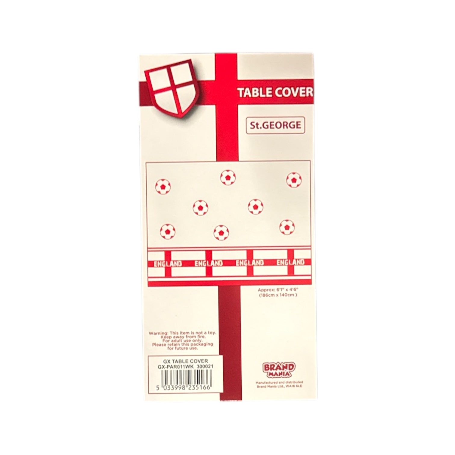 Set your party table with this fun England St George plastic table cover made of wipe clean plastic. Make your England or St George party, Patriotic party, Sports party or England themed party extra special with these St George flag design table covers. Lightweight, durable and can be folded away compactly and reusable. Table Cover Measures: 186cm x 140cm.