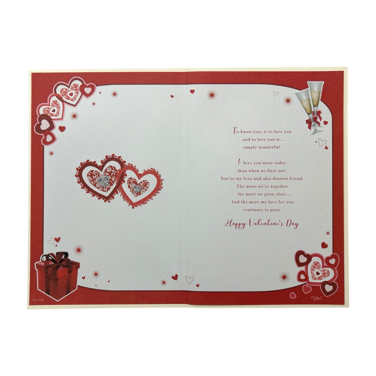 To My Boyfriend Gold Foil Finished Red Valentine's Day Card. Delve into the season of love and make sure your husband feels treasured and loved, with this gorgeous Valentine's day card from Xpress Yourself. The perfect way to warm his heart. This textured card features gold foil details, embossed elements, ribbon and gems attached and comes with white envelope.