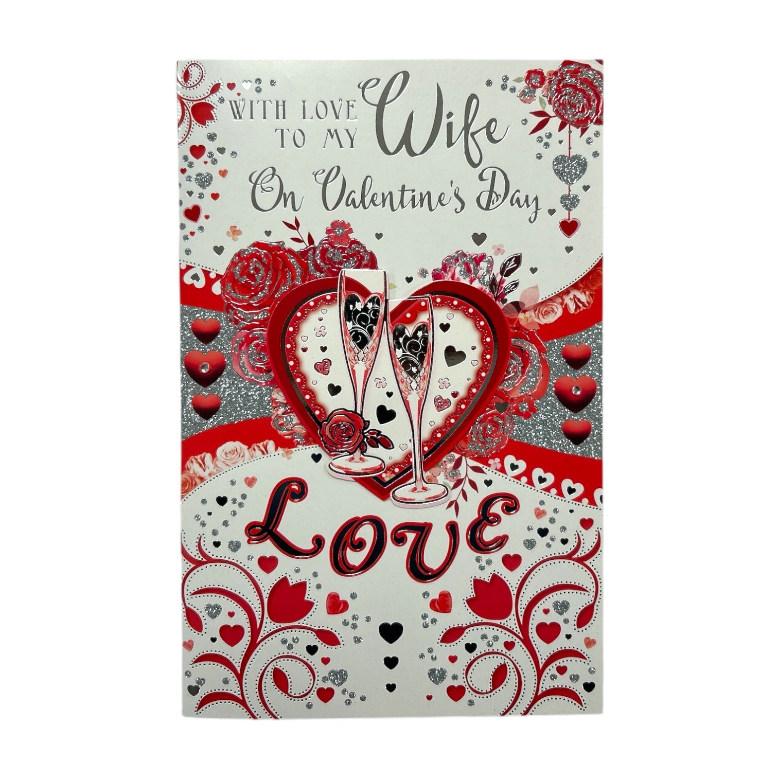 To My Wife Hearts and Champagne Glass 8 Page Insert Valentine's Day Card. Best Selling Sentimental Verses. Top Quality Card With Silver Glitter.