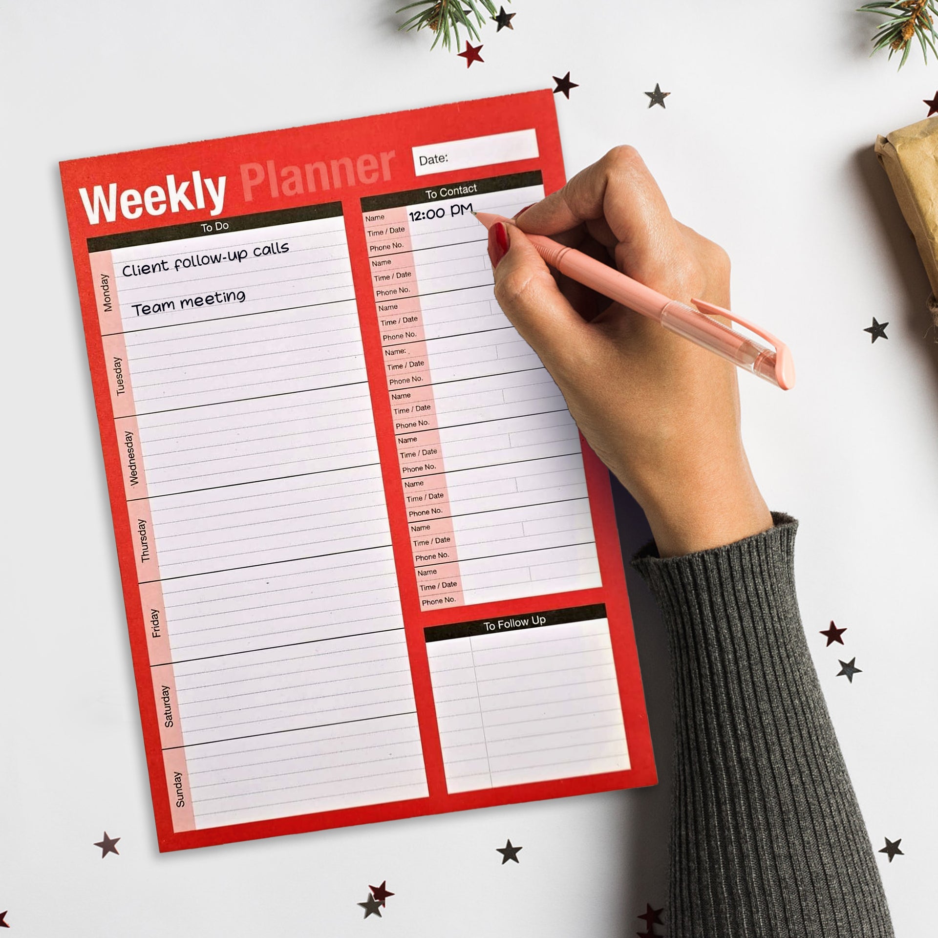 A4 Undated Weekly Desk Planner with 52 tear‑off sheets — a versatile week‑to‑view notepad designed for flexible planning. Each page features a full‑week spread (Monday to Sunday) with daily columns for tasks and appointments. Additional sections include a “To Contact” area to log names, times/dates, phone numbers and details, plus a “To Follow Up” box for reminders or ongoing tasks. The undated format allows users to begin planning any week of the year, avoiding wasted pages. Glued along the top edge for easy tear‑off and clean desk management. The pad’s A4 size offers ample space for notes, planning, and scheduling — perfect for office, home, or study desk use.