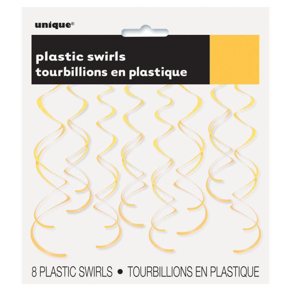 Pack of 8 Sunflower Yellow Solid Hanging Swirl Decorations. Yellow Hanging Decorations measure approximately 66cm (26") in length. Add cheerful colour to a gender neutral baby shower, picnic, Hawaiian party, summer BBQ, Easter party or other special occasion. Hang above the party table, or from a ceiling, doorway or archway at your party venue for a classic, subtle accent. Coordinate with other yellow party decorations and party supplies from our range.