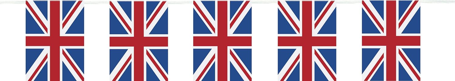 10m Best of British Flag Banner. Union Jack Bunting measures 32.8ft (10m) in length. Ideal for decorating a street party, garden party, royal party occasion or major sporting event. Simply drape bunting banner across party tables, tape to walls or across archways, or string along fences and trees outdoors.