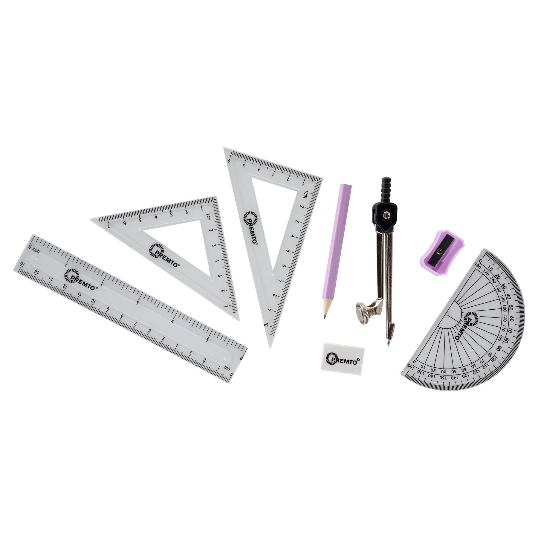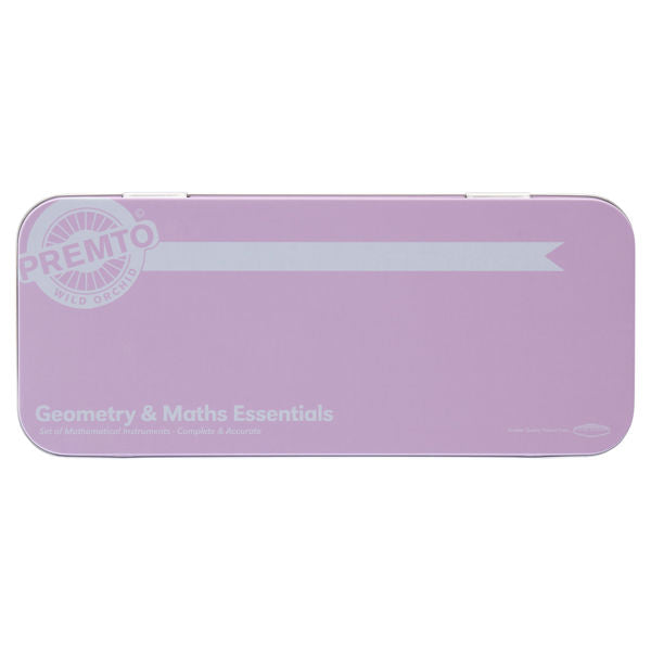 9 piece Wild Orchid Maths Set By Premto. Ultimate Geometry and Maths Essentials. Set includes: Ruler, Pencil, Sharpener, 45 degree set square, 60 degree set square, Eraser, Compass, 180 degree protractor, Timetable & measurement sheet.