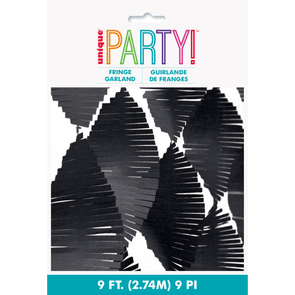 9ft Black Tissue Fringe Garland. Tissue paper garland measures 2.74m long x 15cm wide. Ideal for decorating a birthday party, graduation or Halloween party. Hang, twist or drape along walls, ceilings and tables.