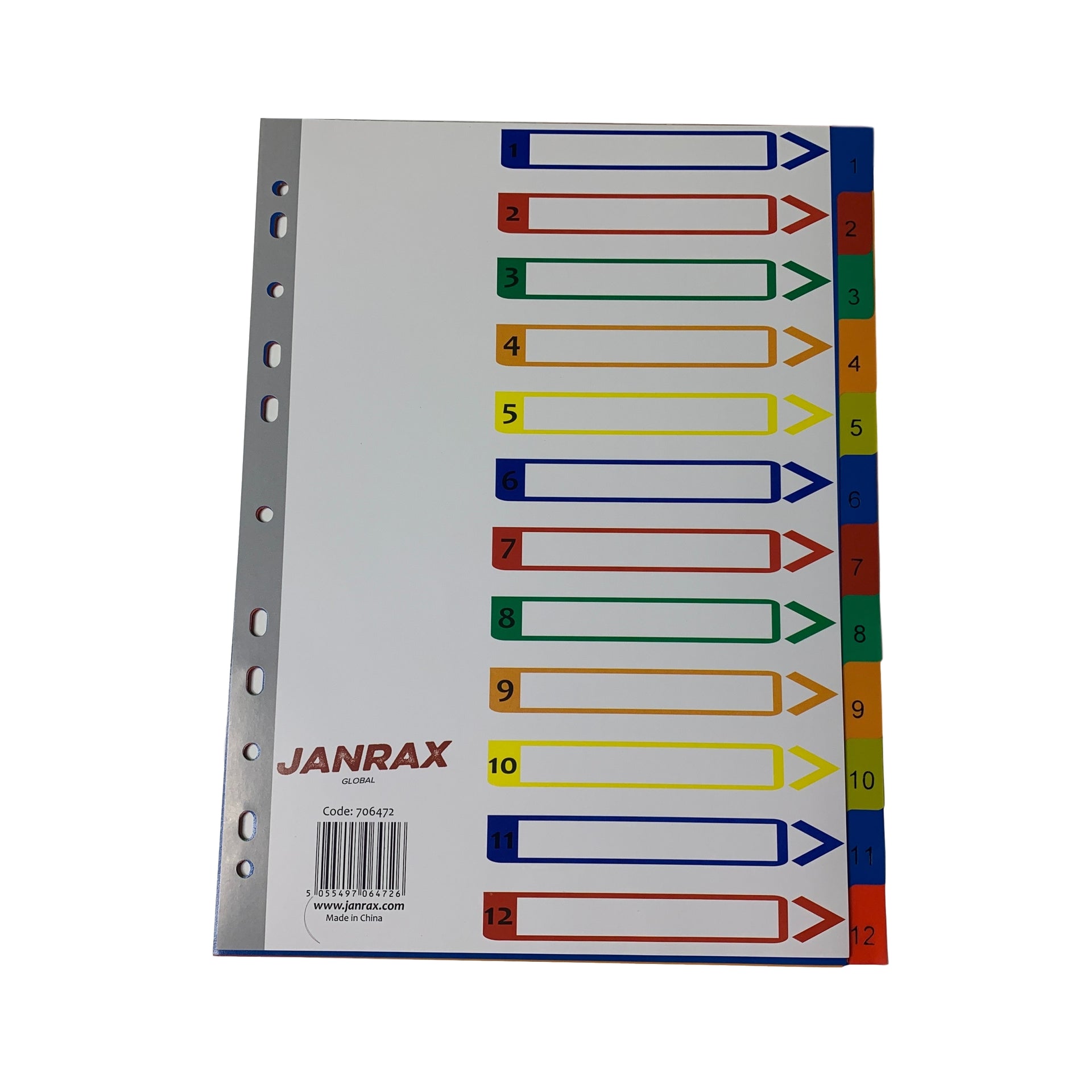 12 Part A4 Polypropylene Dividers with Reinforced Index Cover by Janrax. Multipunched 120 Micron Hard wearing A4 PP sheet dividers. Assorted colour tabs for quick identification. The front index sheet provides space for labelling to make referencing quick and easy. Made from tear-resistant, wipe clean polypropylene.