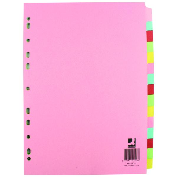 Q-Connect Subject Dividers. Colour coded multi-punched dividers suitable for use in most types of binders. Individually shrink wrapped to ensure dividers are kept in good condition. Size: A4. 15-Part Plain Multi-coloured.