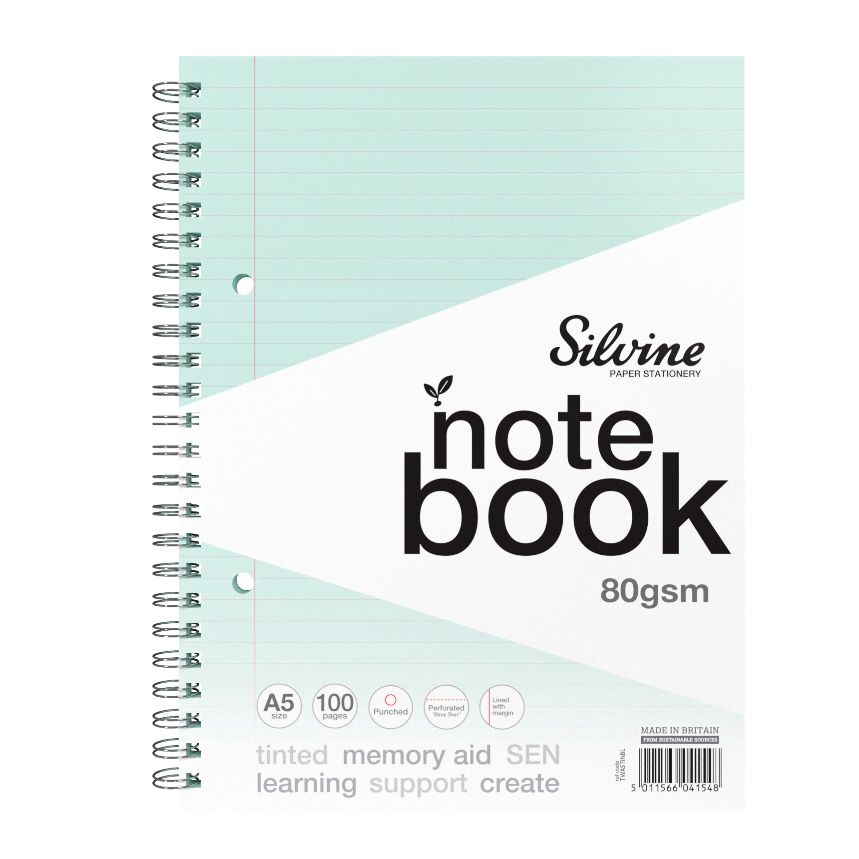 Silvine A5 Blue Paper Dyslexia Notebook - Lined with Margin (100 Pages). Specifically designed with blue tinted paper, our premium 80gsm wirebound notebook reduces visual stress and enhances focus, making it an ideal memory aid for SEN supportive learners. Visual aid notebook with feint ruled lines and margin which subtly fade into the background to ensure your writing stands out, promoting better focus and clarity. The robust wire binding allows the notebook to lay perfectly flat for comfortable writing on any surface, while punch holes and micro-perforations enable easy organization and filing. This A5 blue tinted notebook offers 100 pages of high-quality 80gsm paper for longer study sessions, note-taking, and assignments; covering your academic and professional needs. Slightly larger than standard A5, removed pages remain full-size ensuring seamless filing in folders and binders. Finished notebook dimensions - Sidebound 212 x 159.5 mm.