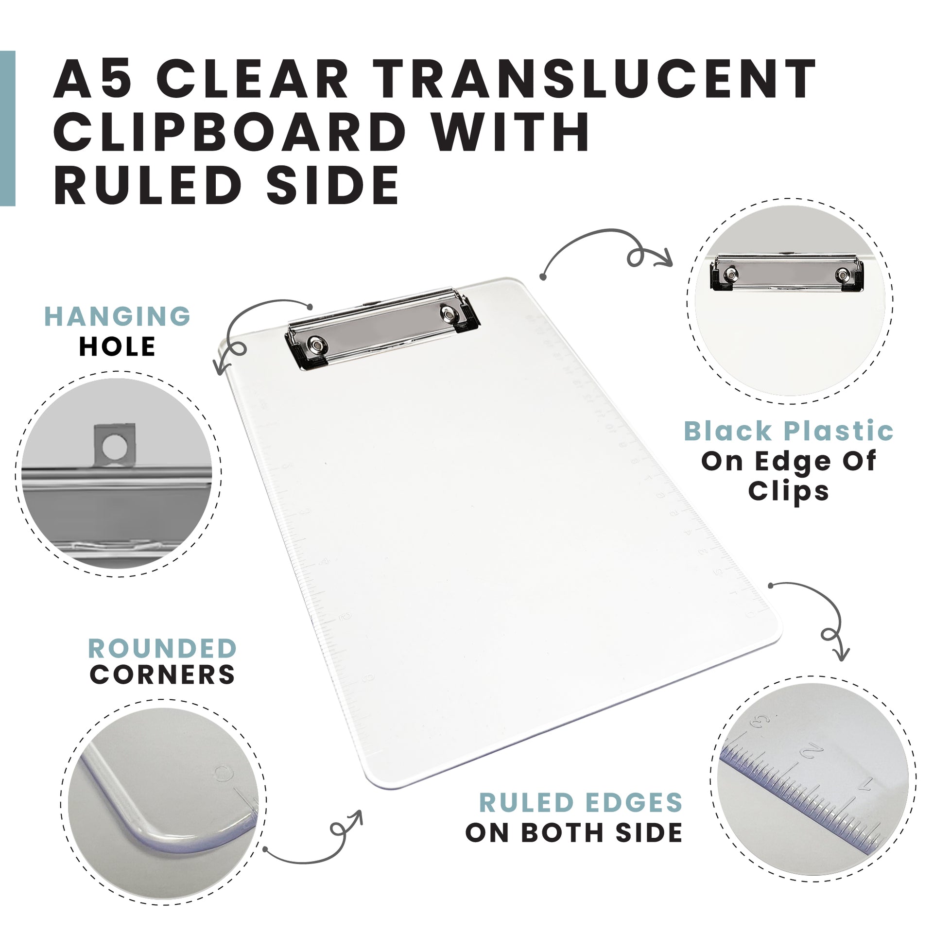 Quality A5 Clear Translucent Clipboard. Includes a Ruled edges on both side. Size of Clipboard: 226mm x 150mm. Includes Hanging Hole. Black Plastic on Edge of Clips to keep documents safe.