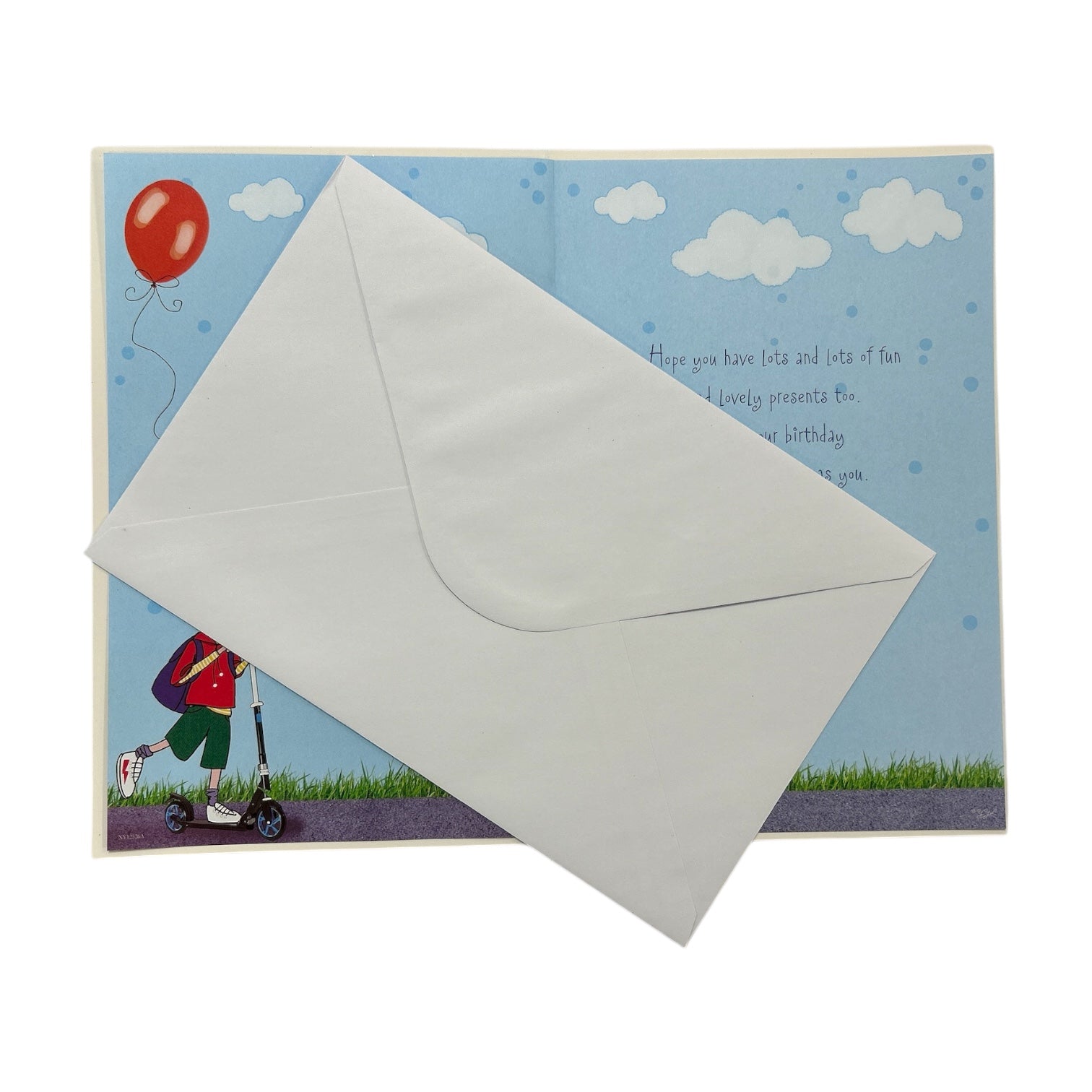 Celebrate a fun-filled 5th birthday with this playful and exciting birthday card! The card features a boy riding a scooter, accompanied by his trusty dog by his side. The background showcases a blue sky with fluffy clouds, glitter stars, and festive star foil balloons and orange balloons that add a cheerful touch to the scene. The text "You're 5 Today" and "Birthday" are in bright, multicolored lettering, creating a joyful and celebratory vibe. A special large, round badge with the words "5 Today" adds a fun and interactive element to the card. Inside, yo u'll find heartfelt birthday wishes, making this the perfect card to send your love and best wishes on his milestone day. The card comes with a coordinating envelope. Approximate size: 27.5 x 18.5.