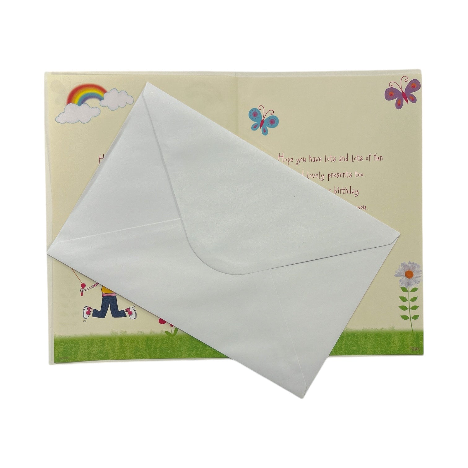 Celebrate your little girl's 6th birthday with this fun and vibrant card! The card features a bright, colorful design with a cheerful girl happily jumping rope, surrounded by two adorable white dogs on each side. In the background shimmer fluffy clouds, a beautiful rainbow, and butterflies fluttering about, creating a joyful and magical atmosphere. The text "You're 6 Today" and "Birthday" is written in multicolored lettering, adding a playful and festive touch. Additionally, a large, round badge with the words "6 Today" gives this card an extra fun element. Inside, there are heartfelt birthday wishes, making it the perfect way to celebrate her special day. This card is sure to bring smiles and make her feel extra special on her big day! The card comes with a coordinating envelope. Approximate size: 27.5 x 18.5.