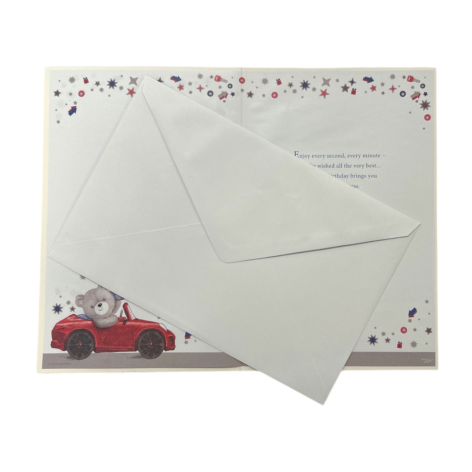 This delightful birthday card captures the joy and excitement of a special day with an adorable card. Features an adorable teddy bear driving a red car, bringing a sense of fun and adventure to the celebration. Surrounding the teddy and car are colorful gift boxes and twinkling stars, creating a cheerful and celebratory atmosphere. Thoughtfully placed shimmer accents bring extra vibrancy to the card, making it truly special. Inside, the card continues the warm sentiment with heartfelt birthday wishes. It comes with a coordinating envelope. Card size approx. : 27.5 x 18.5 cm.