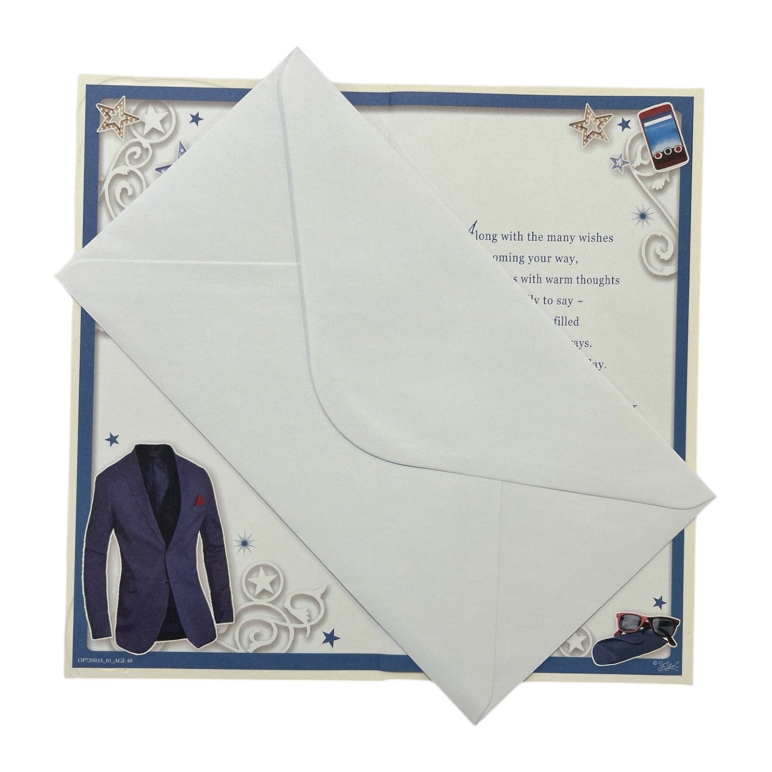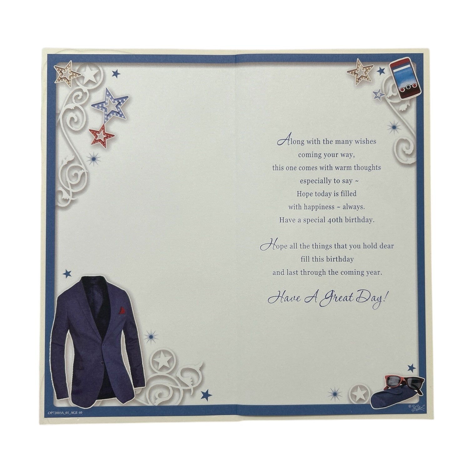 Celebrate a milestone 40th birthday with this stylish and sophisticated card. The front features a striking embossed design of a blazer, accented with sparkling foil stars for a touch of glamour. A lovely verse adorns the front, while the inside continues with the same elegant design and heartfelt birthday wishes. This card is a perfect way to mark this special occasion. The card comes with a coordinating envelope. Approximate size: 9" x 4.75" (23 cm x 12 cm).