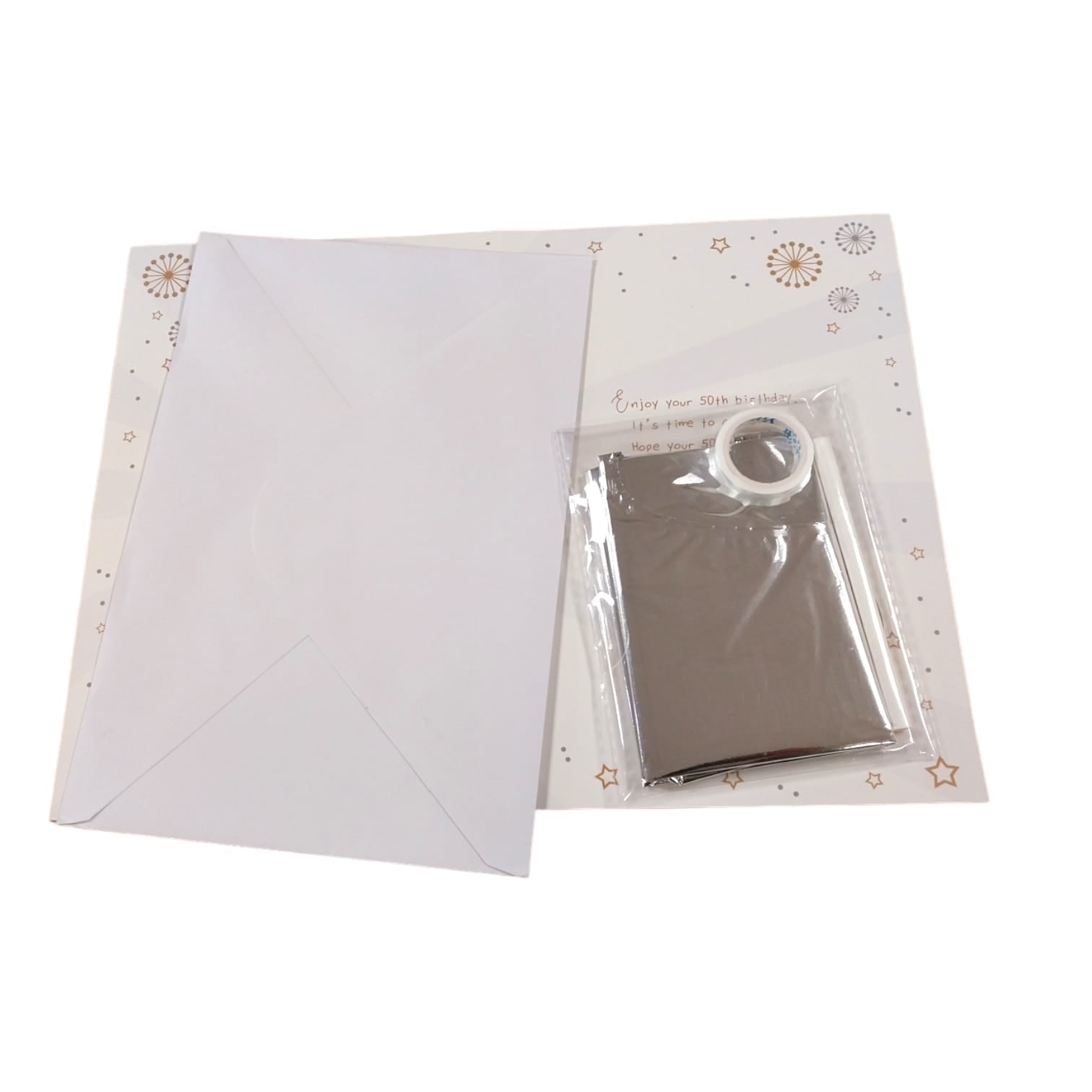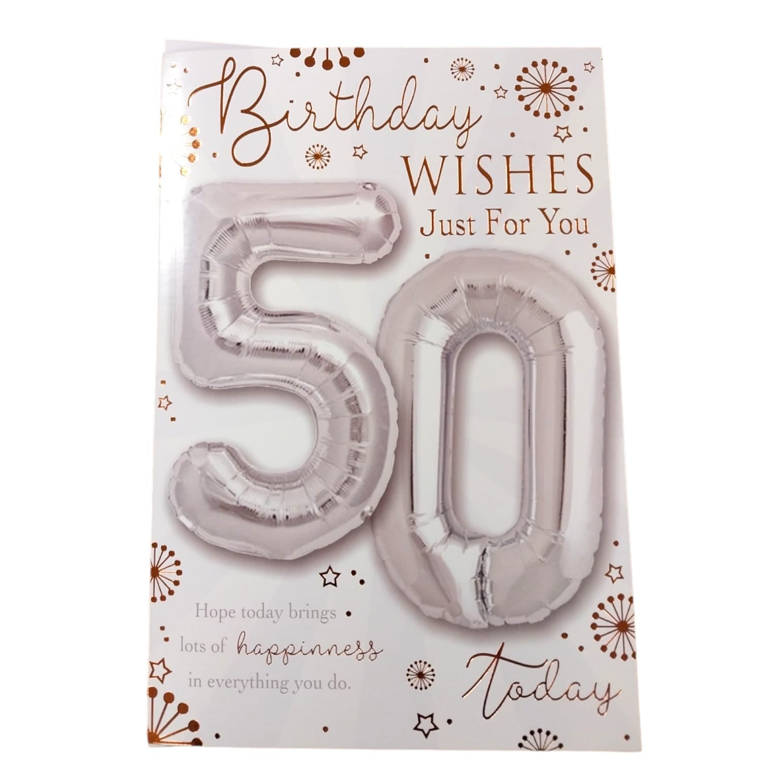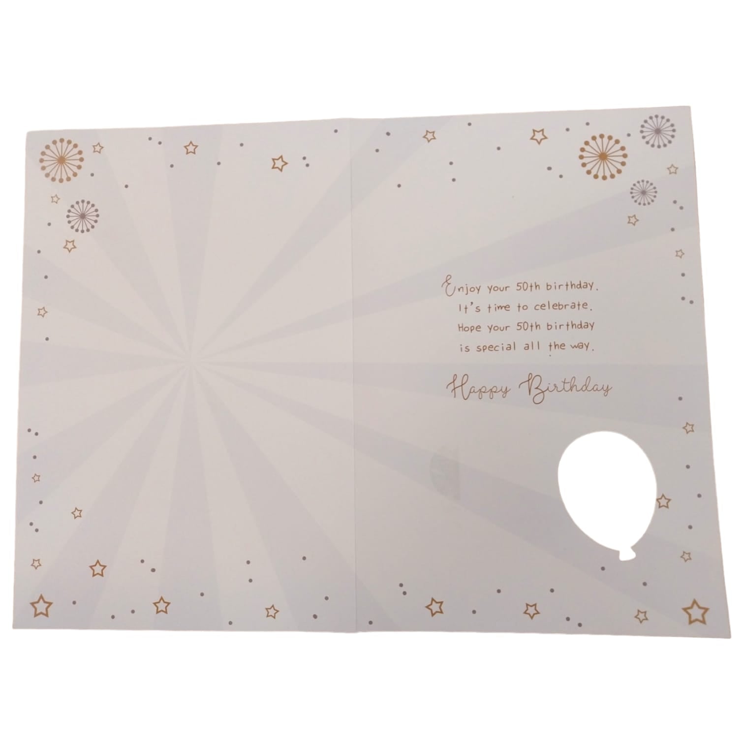 A contemporary foil finished greeting card by Balloon Boutique. Air fill only (not suitable for helium). Includes 2 Foil Balloons, straw for inflating balloons. 2m Ribbon for handing balloons. Unsuitable for helium. Size of card 230x150mm. Message inside: Enjoy your 50th birthday. It's time to celebrate. Hope your 50th birthday is special all the way. Happy Birthday.