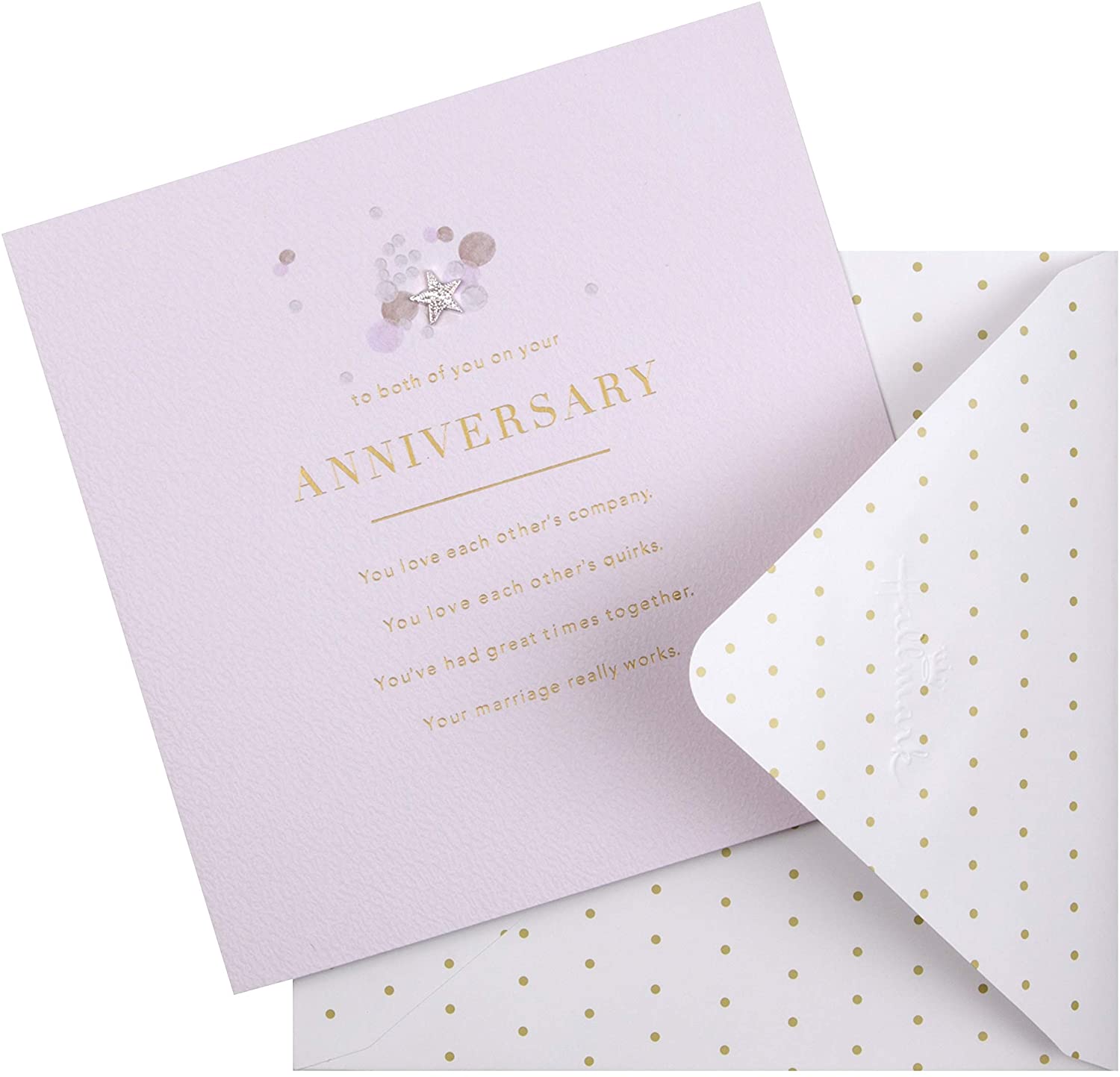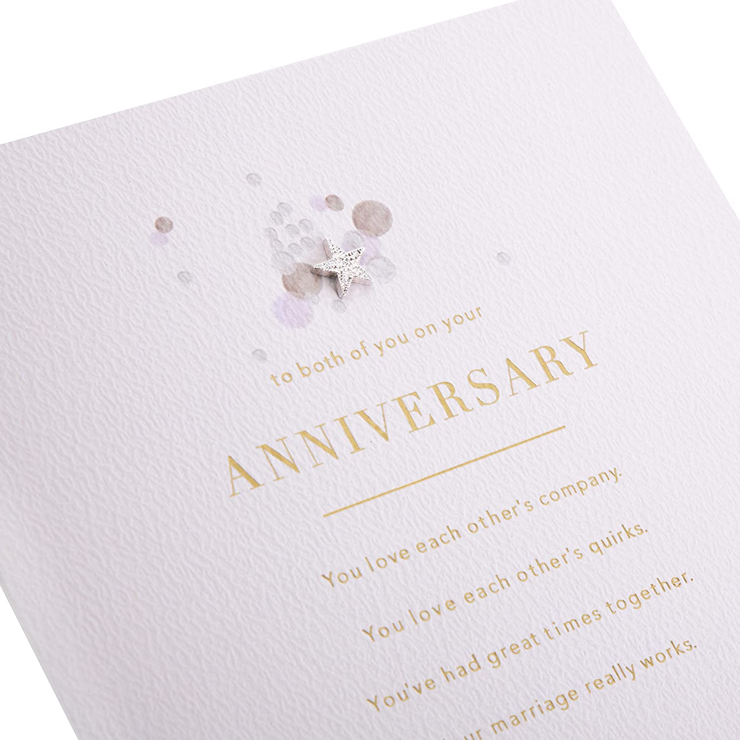 Elegant Text Led Design Anniversary Card to Both. Finish: Silver Star gem attachment, Gold foil. Card material: Textured board. Co-ordinating gold foil printed envelope. Front cover wording: 'to both of you on your Anniversary you love each other's company. You love each other's quirks. You've had great times together. Your marriage really works'. Message inside card reads: 'Congratulations on your special date and your special marriage'. Size: 165 x 165mm.