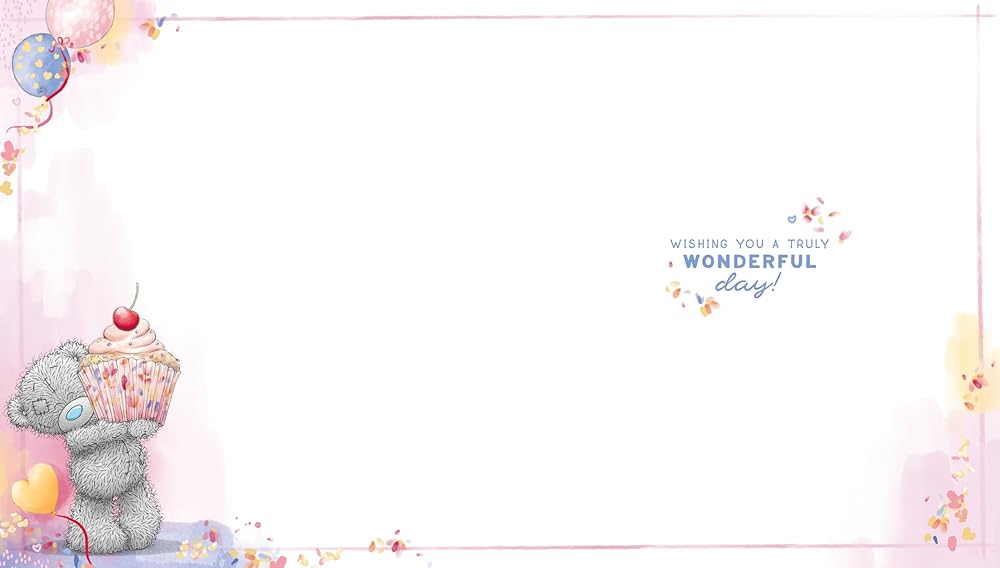 Bear Putting Cherry On Cake Cute Birthday Card. Wish a special friend or family member a very happy birthday with this adorable card from Me to You. This delightful design showcases the instantly recognisable grey Tatty Teddy, complete with signature blue nose and patches, standing on a stool and carefully placing a cherry on top of a large, inviting cupcake, surrounded by vibrant balloons and sparkling confetti. Printed on high-quality, sustainably sourced board, the card is enhanced with exquisite gold foil and embossed details, adding a touch of sparkle and luxury that makes it a memorable keepsake. The cover message reads 'It's time to celebrate your Birthday. Because you're loved in every way', perfectly conveying warm and loving wishes. The inside of the card reads 'Wishing you a truly wonderful day!', making it ideal for friends or family of all ages. Size: 12.7 X 15.2 CM (5 X 6 IN) – crafted from high-quality, durable card stock, this genuine Me to You greeting card is a memorable keepsake that’s sure to be treasured
