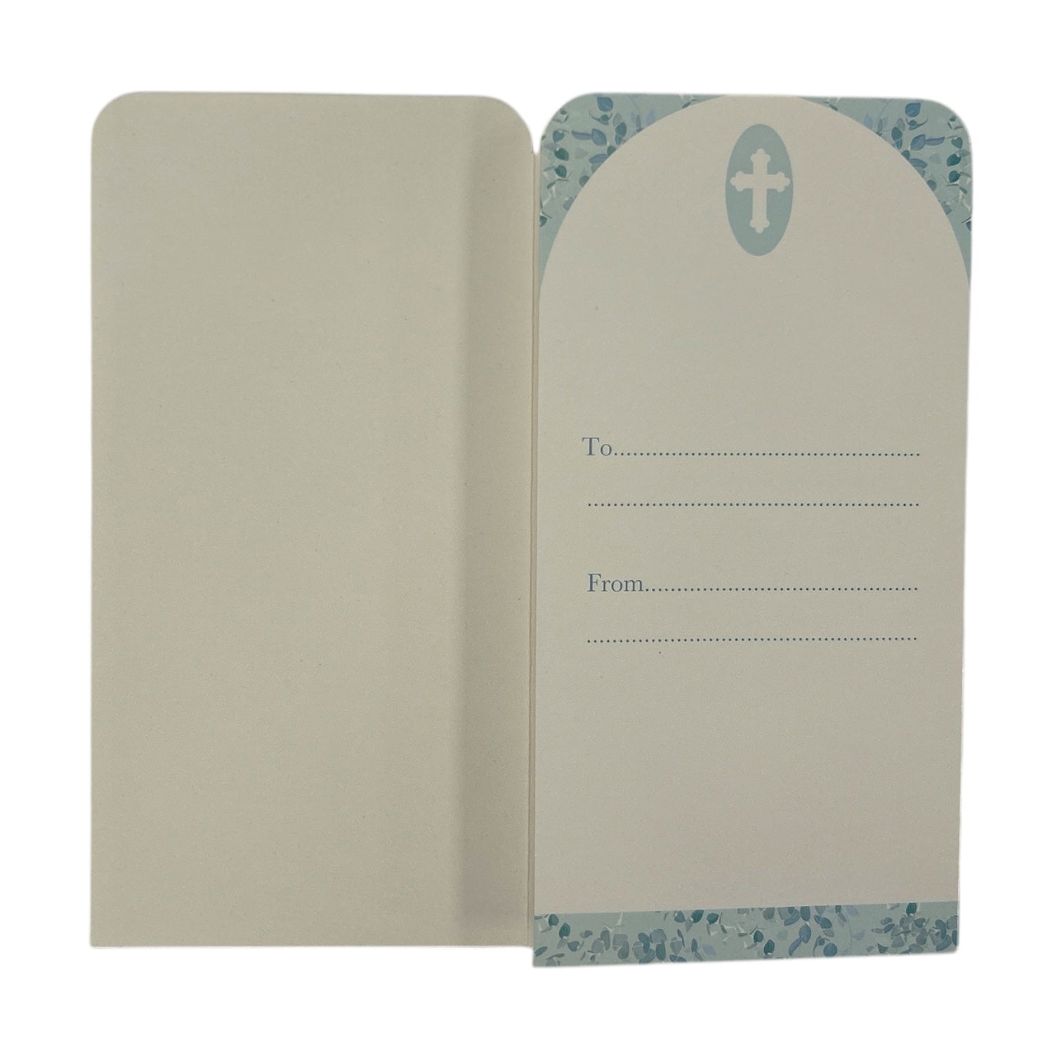 A modern money wallet card, suitable for sending a kind, heartfelt message to a friend or family member alongside a monetary gift on their special day. featuring a simple cross , dove and polka dot design, finished with metallic silver foil details, and the message "On Your 1st Confirmation, God Bless You" on the front. The card comes with a coordinating envelope. Card Size Approx.: Closed: 91 x 177mm, Open (3 fold): 270 x 177mm.