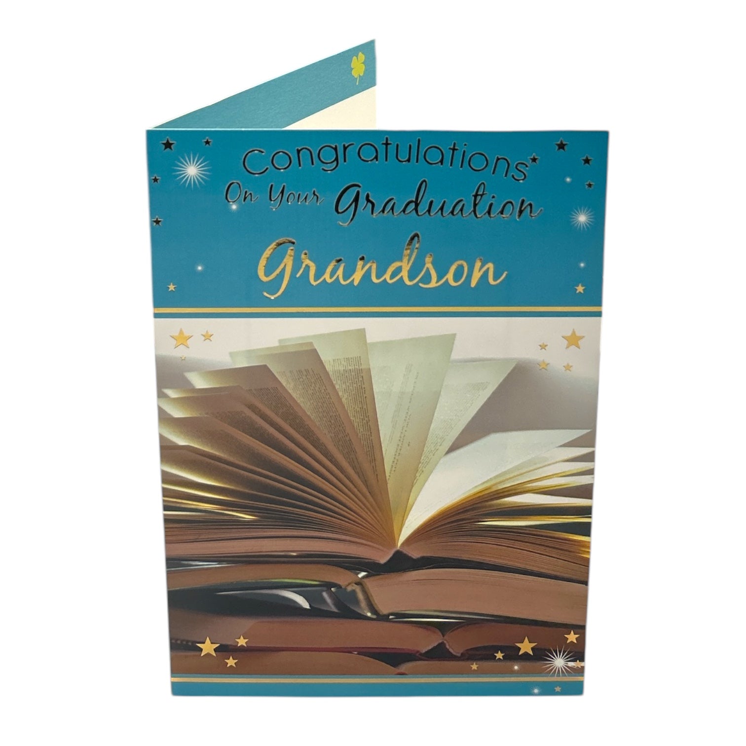 This graduation greeting card for a grandson is a heartfelt way to celebrate his academic achievement. The card features a light-colored background with a festive design, including scattered stars and image of stacked books, symbolizing knowledge and success. Designed with foil details, this card has a shimmering effect that enhances its elegance and celebratory feel. It comes complete with a coordinating envelope. Card size: Approx. 19.5 x 14 cm.