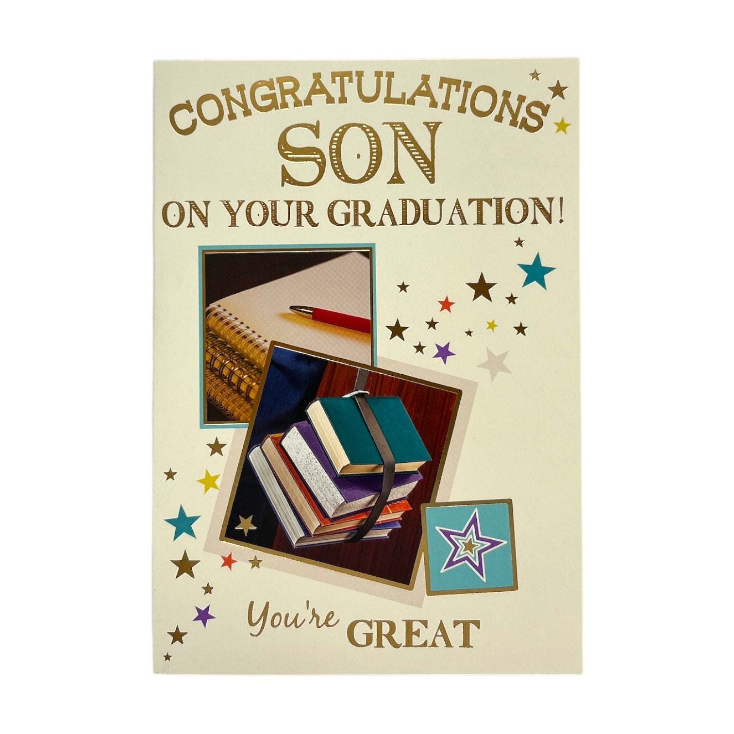 This graduation greeting card for a son is a heartfelt way to celebrate his academic achievement. The card features a light-colored background with a festive design, including scattered multicolored stars and two images of stacked books, symbolizing knowledge and success. Designed with foil details, this card has a shimmering effect that enhances its elegance and celebratory feel. It comes complete with a coordinating envelope. Card size: Approx. 19.5 x 14 cm.
