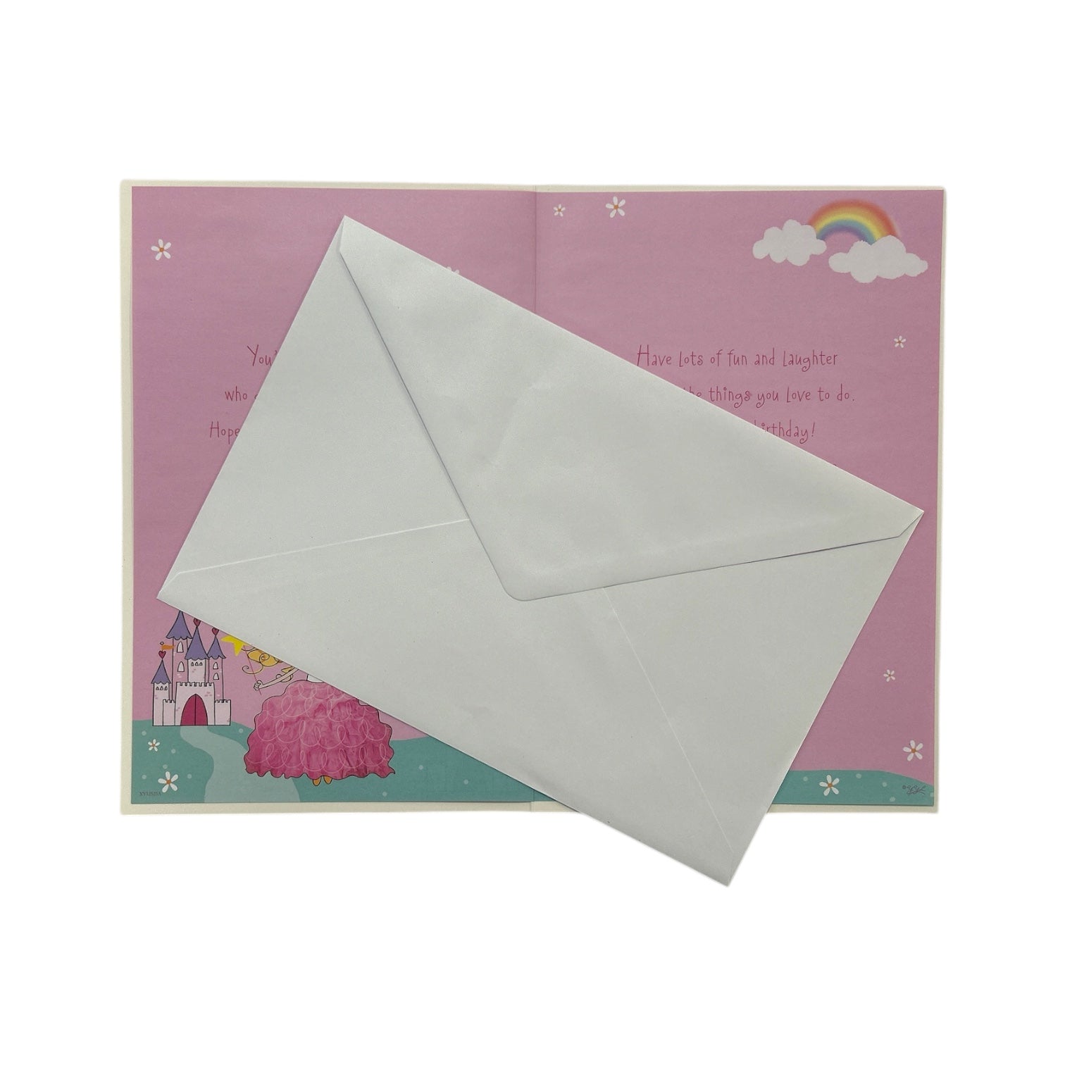 Celebrate a magical milestone with this adorable princess-themed birthday card! The front features a young girl in a glittery pink dress, wearing a crown and holding a magic wand. Beside her is a cute white cat, adding to the enchanting scene. She stands proudly in front of a pink castle, with a backdrop of fluffy clouds and a vibrant rainbow, creating a fairy-tale atmosphere. The text "You're 4 Today Daughter" and "Birthday" is beautifully designed in multicolored glitter, adding extra sparkle to the card. Additionally, a large, round badge with the message "4 Today" adds a fun touch, making this card extra special for your Daughter. Inside, you'll find warm birthday wishes that are sure to bring a smile to his face. The card comes with a coordinating envelope. Approximate size: 27.5 x 18.5.